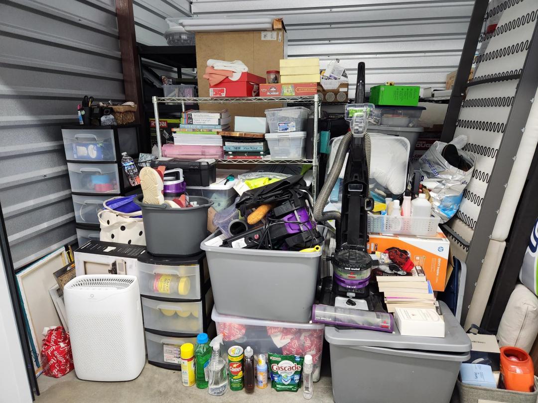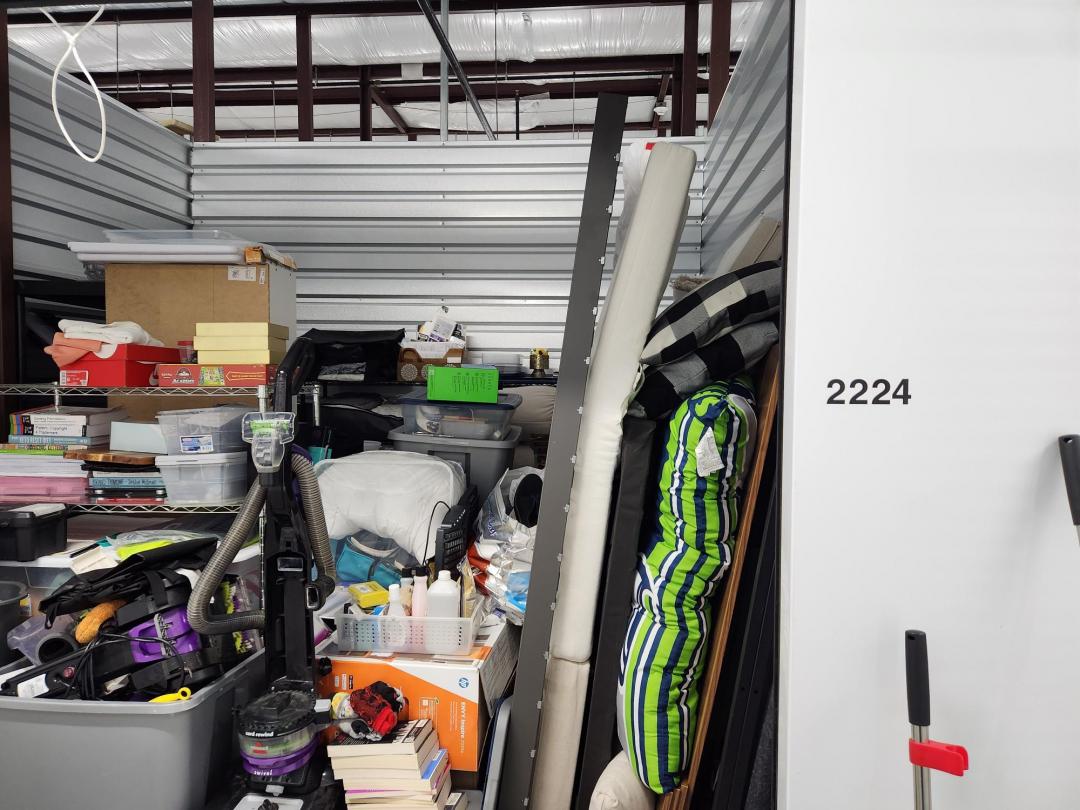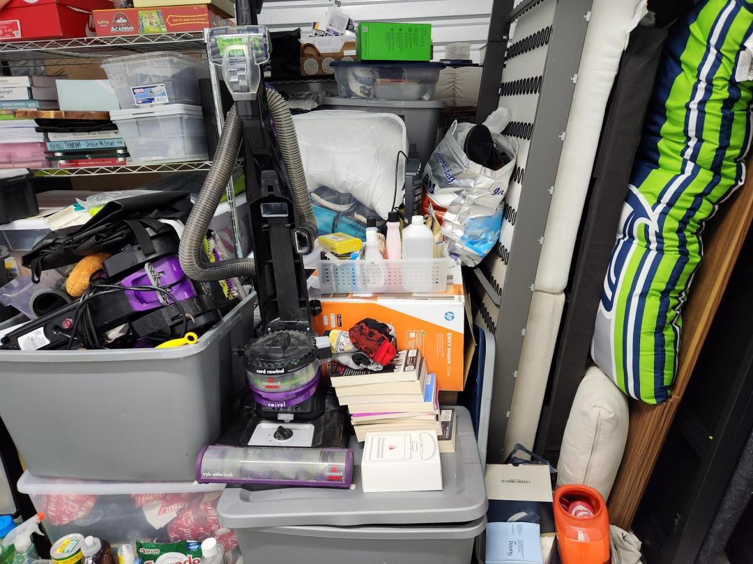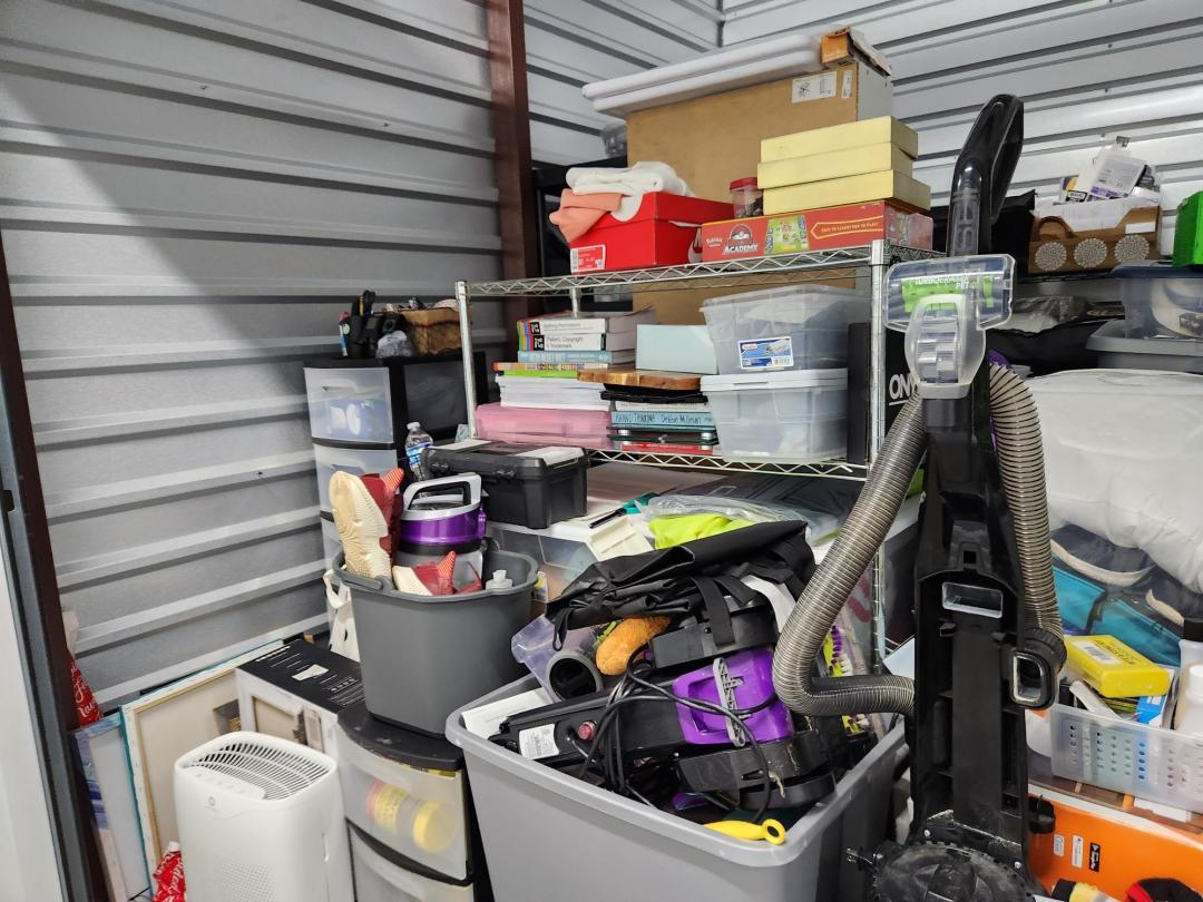 This unit appears to contain…Unit appears to contain, iPhone, vacuum cleaners, plastic bins full, plastic filing cabinet, children's toys, down Comforter, misc. blankets and pillows, misc. clothes.