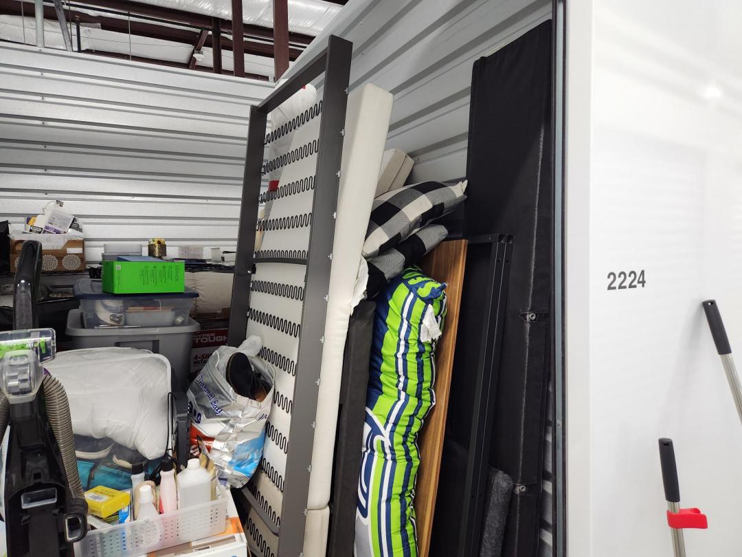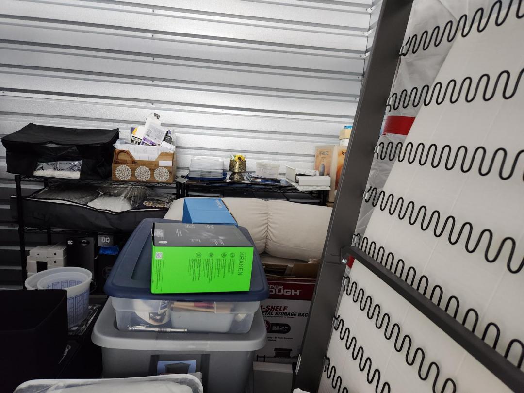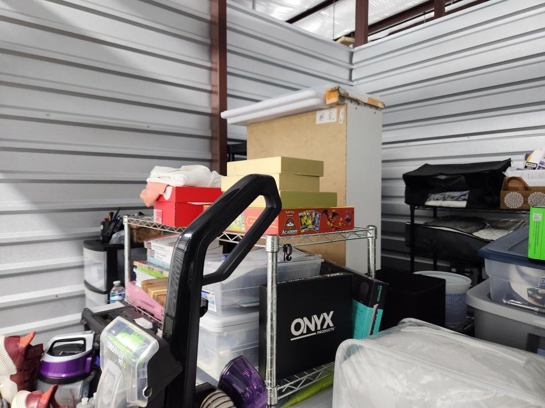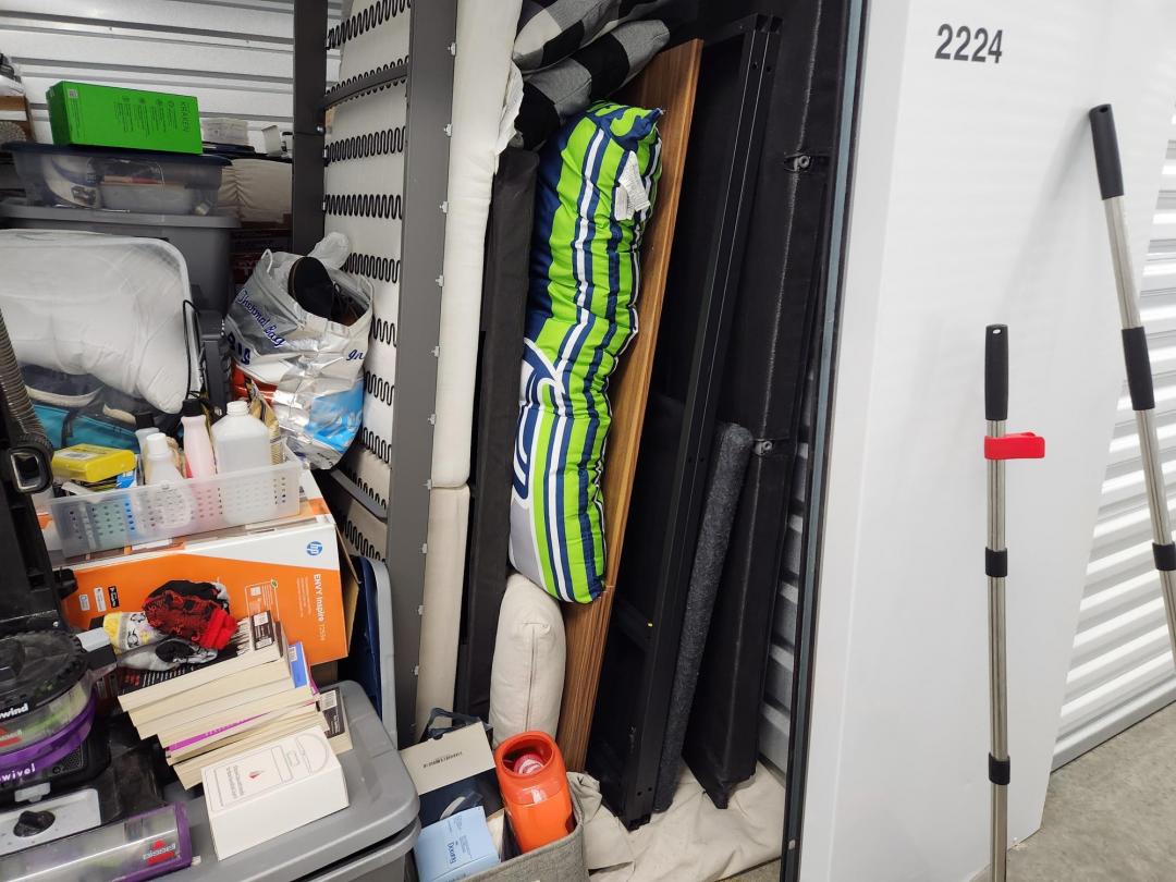 This unit appears to contain…Unit appears to contain, iPhone, vacuum cleaners, plastic bins full, plastic filing cabinet, children's toys, down Comforter, misc. blankets and pillows, misc. clothes.