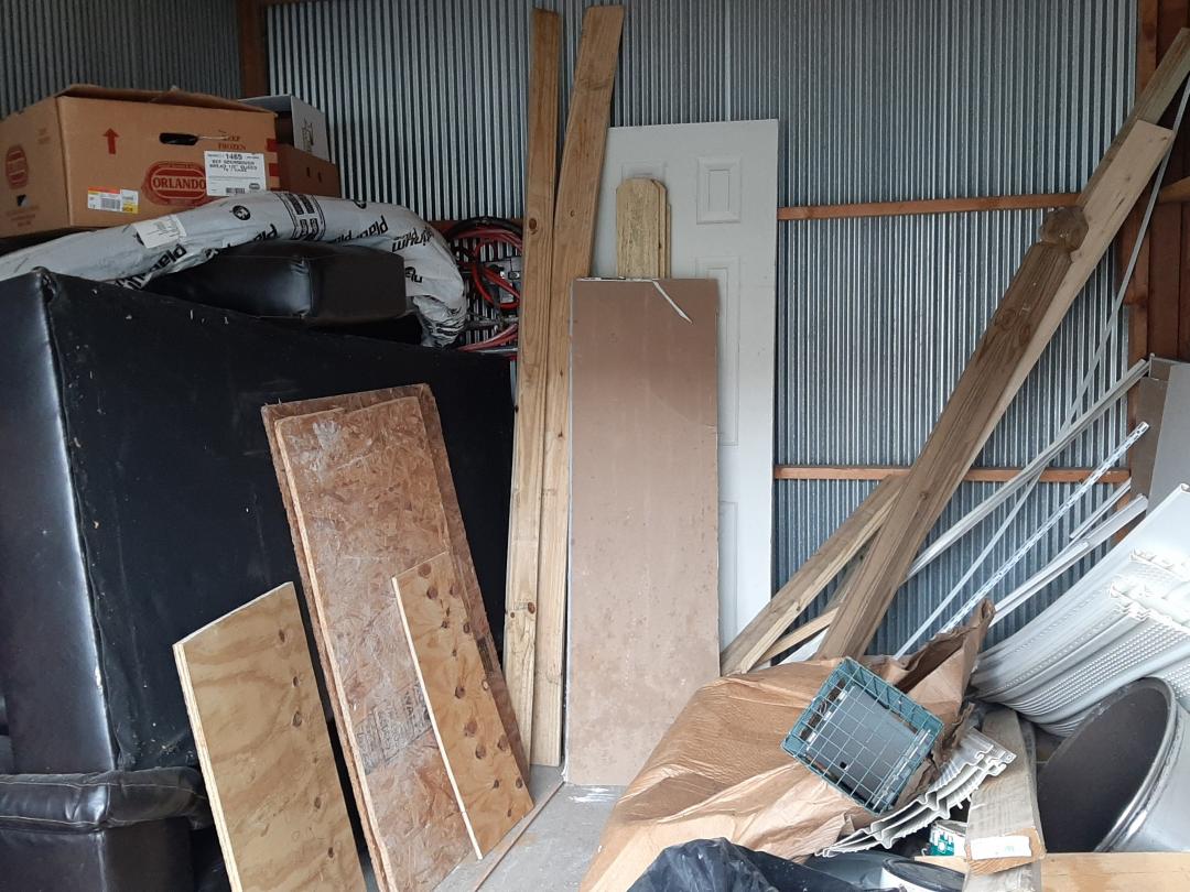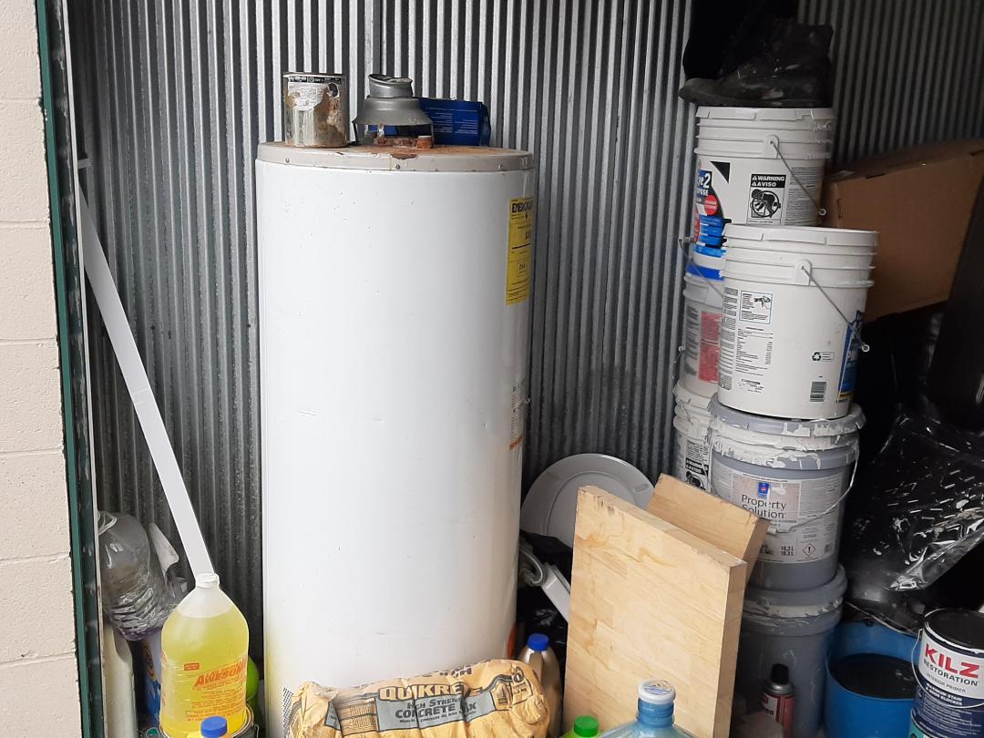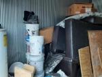 This unit appears to contain…Unit appears to contain, water heater, couch, interior door, siding, dry wall, paint buckets, fishing gear