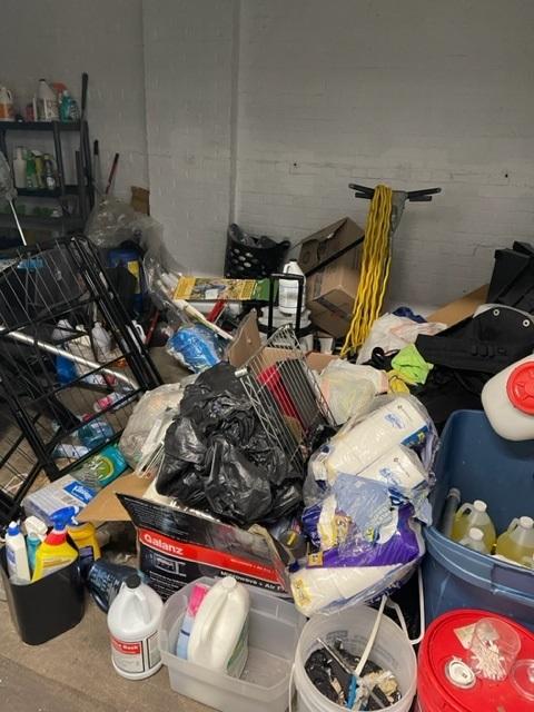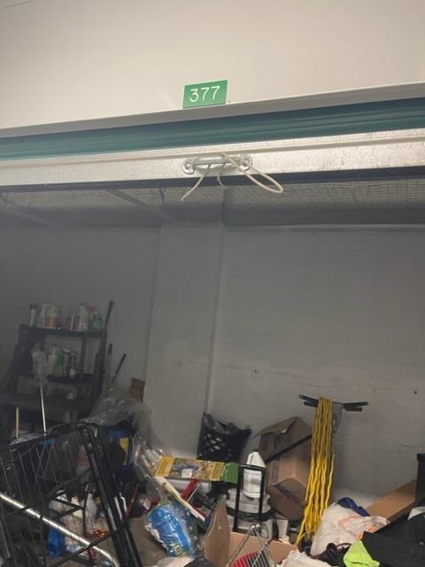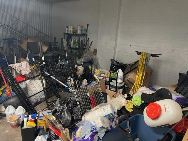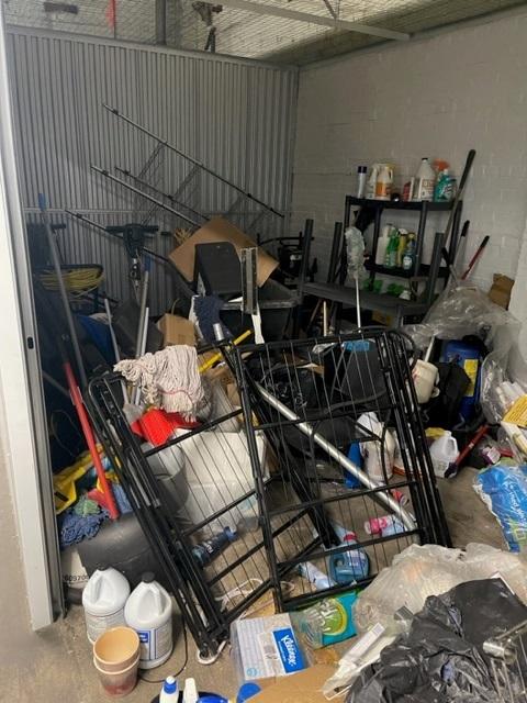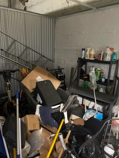 This unit appears to contain…Cleaning supplies, floor cleaner, vacuum, mop, brooms, shelving, totes