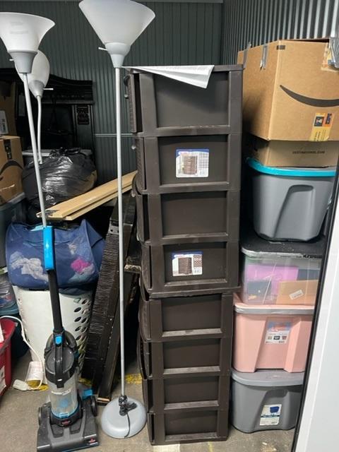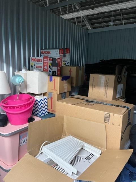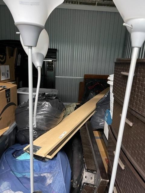 This unit appears to contain…totes, bed frame, AC units, bags, boxes, table, lamp