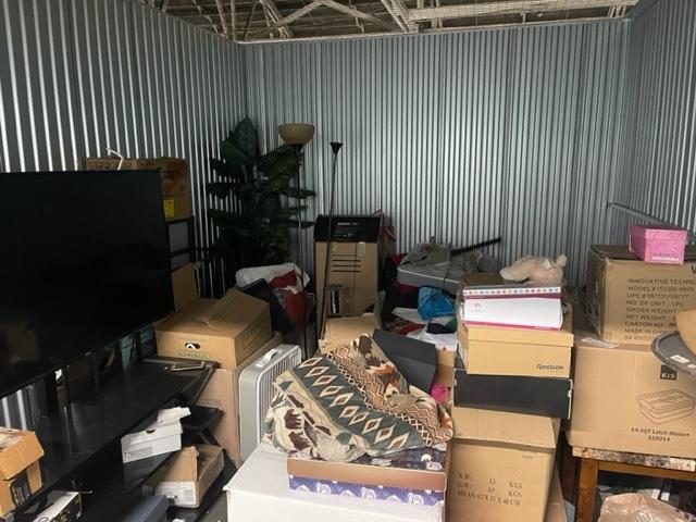 This unit appears to contain…TV, TV Stand, boxes, fan, table, lamp