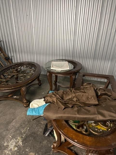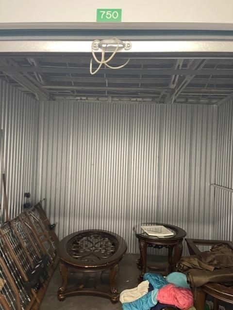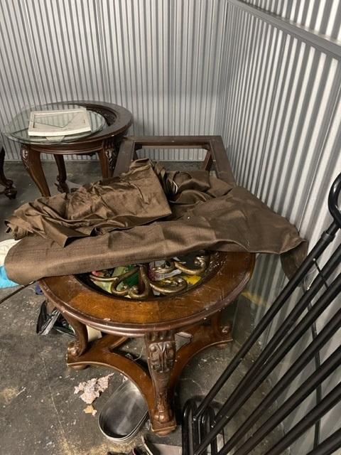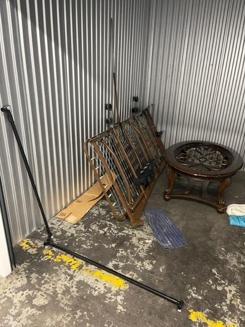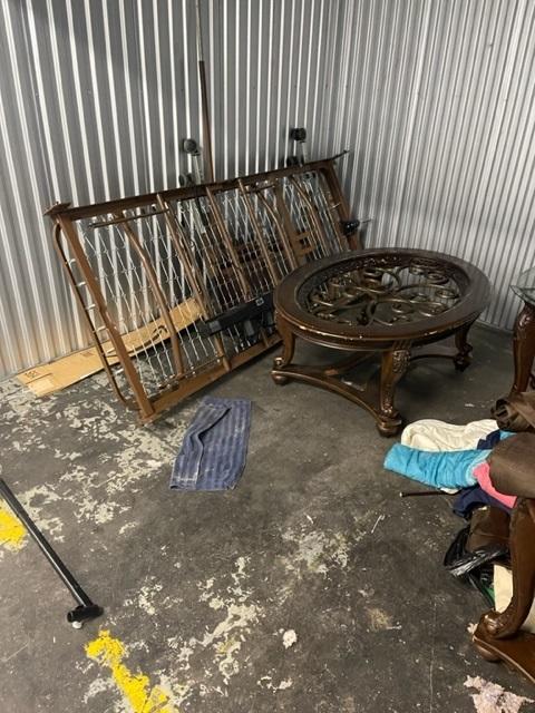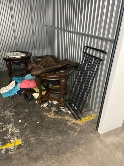 This unit appears to contain…Bed frame, end table, coffee table, clothes, bags