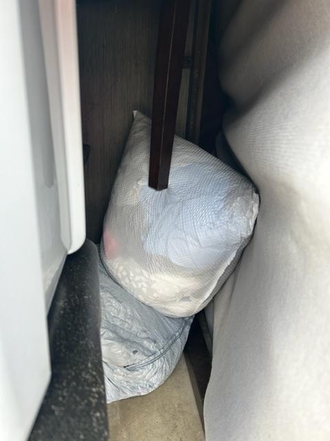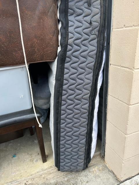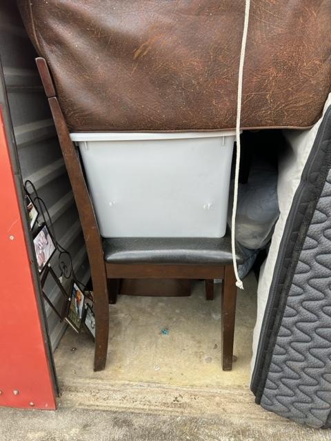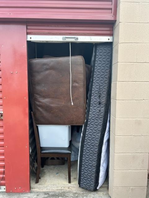 This unit appears to contain…This unit contains: mattress, couch, chair, tote, picture frame, bags, and clothes.