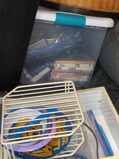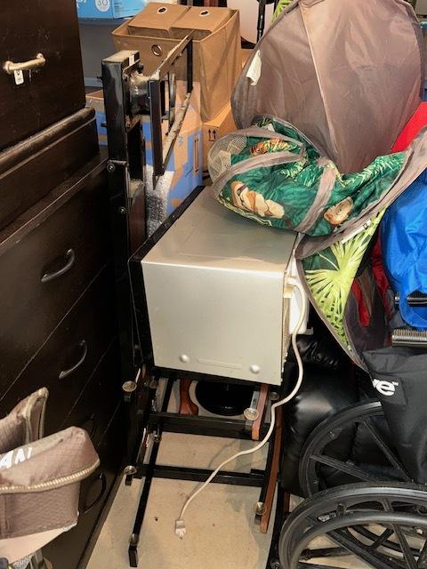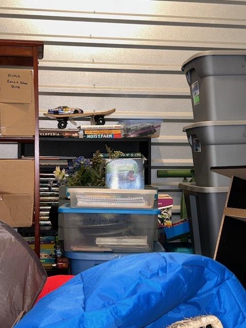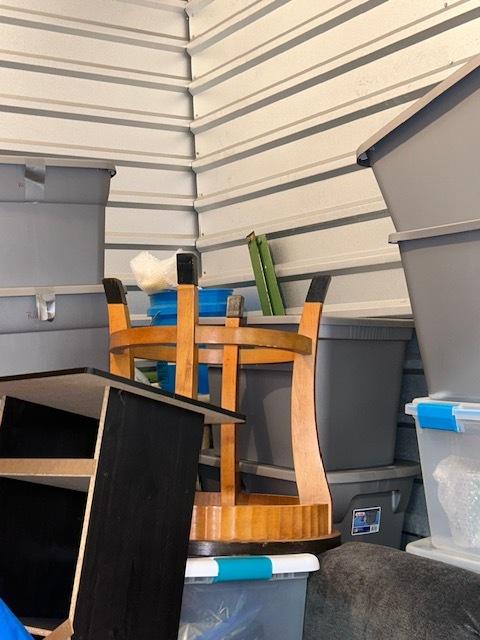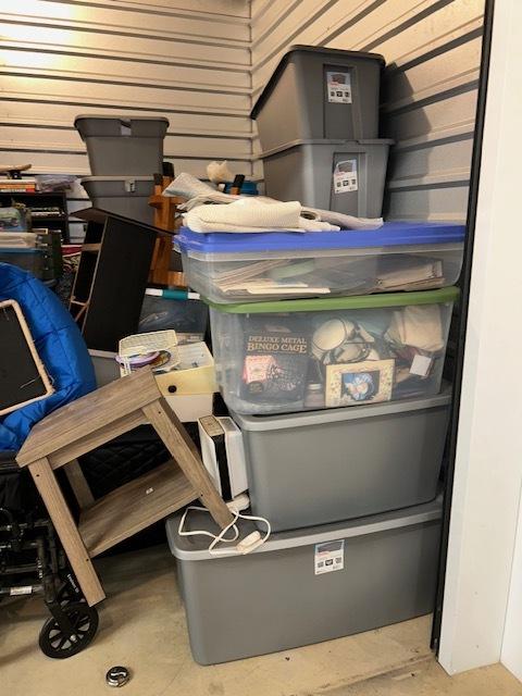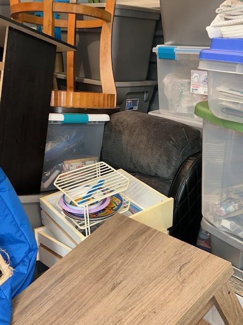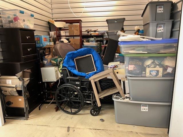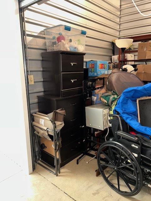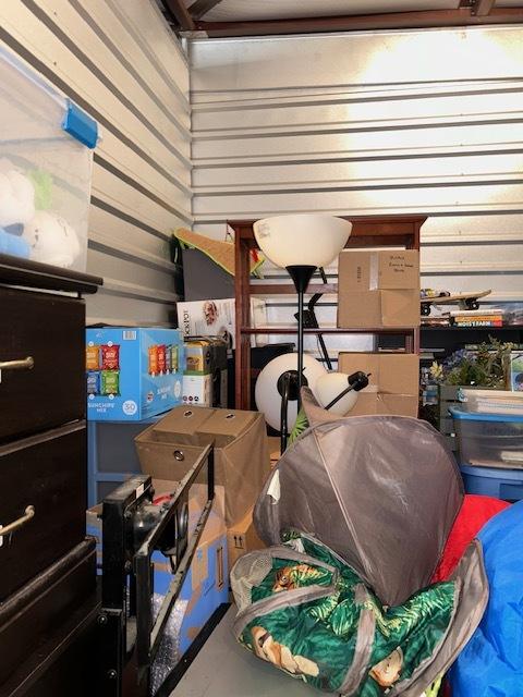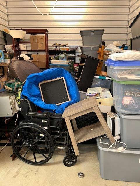 This unit appears to contain…This unit contains: A chest, side tables, folding chair, stool, wheel chair, bean bag chairs, totes, boxes, tv stand, floor lamp, globe, microwave, cat toys, book shelf, organizers, movies, books, tables, Christmas decorations, recliners, and other misc items.