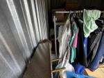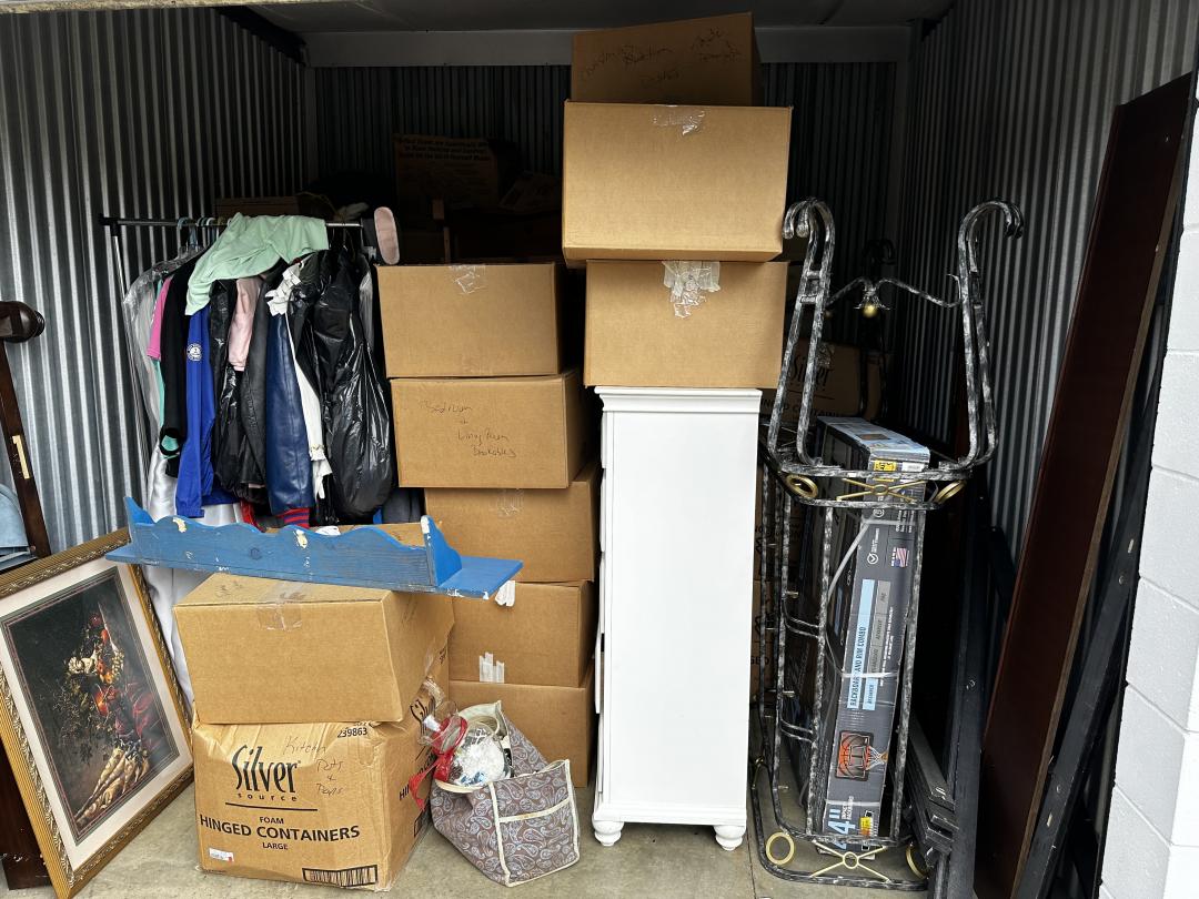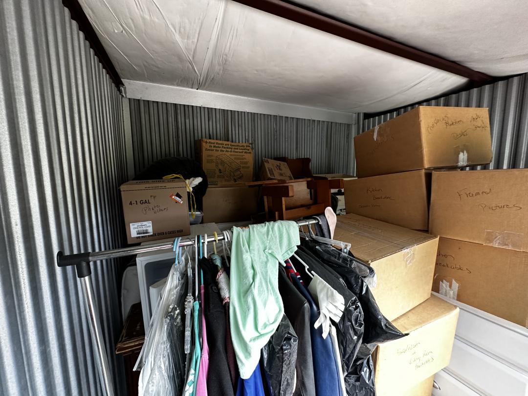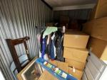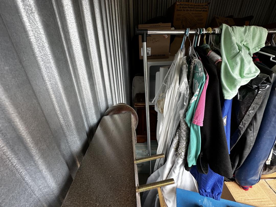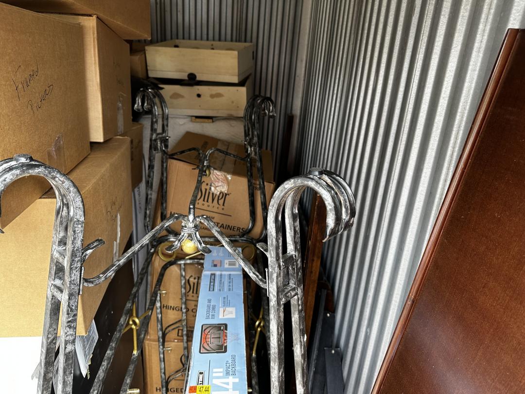 This unit appears to contain…chest of drawers, wall art, clothes, prom dress, sleigh bed headboard and footboard, wall mounted basketball goal, mini fridge, queen mattress and box spring, night stand, wooden chest, kitchen pots and pans, misc. boxes
