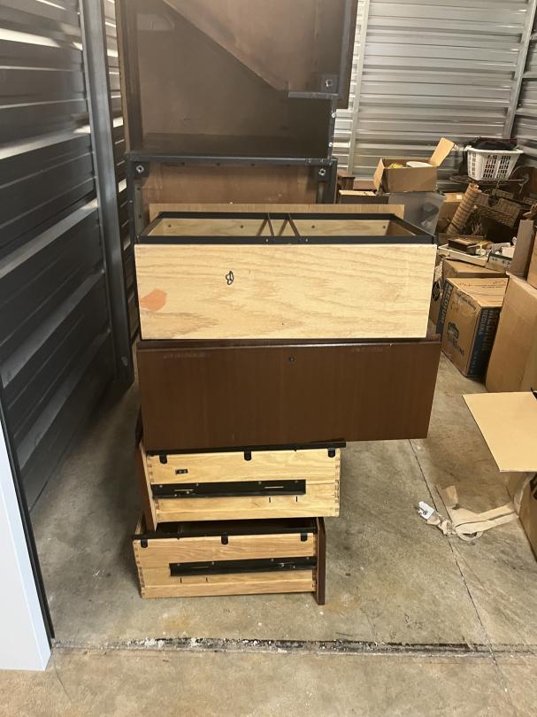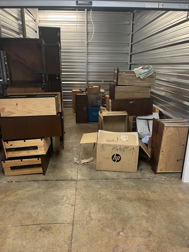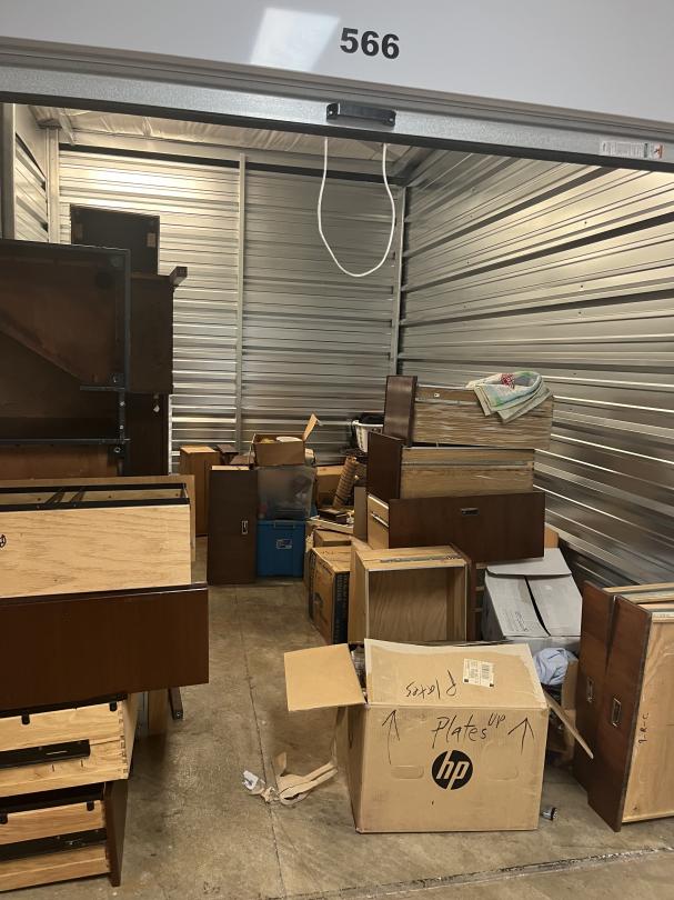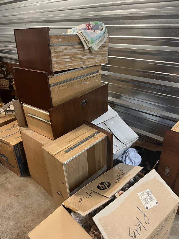 This unit appears to contain…Climate Controlled First Floor office desks, bird cage, bench, boxes, side table, misc. stuff