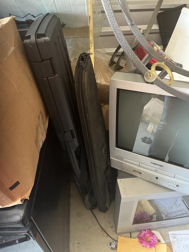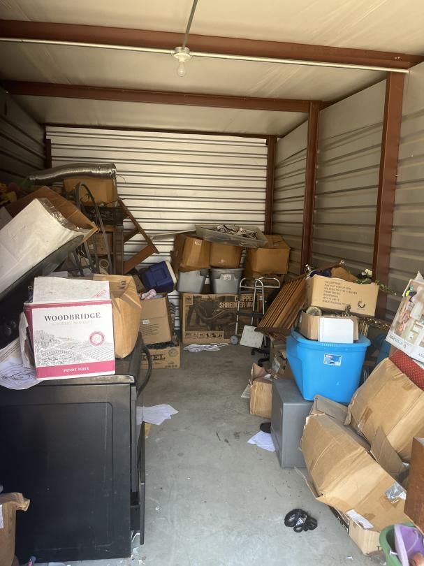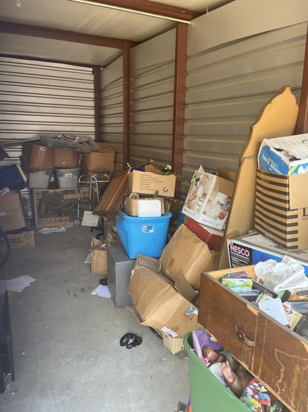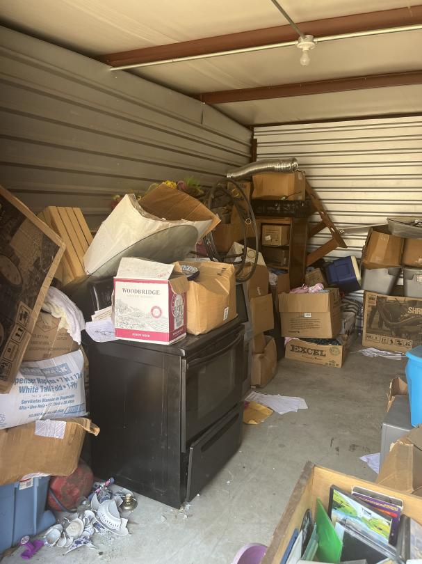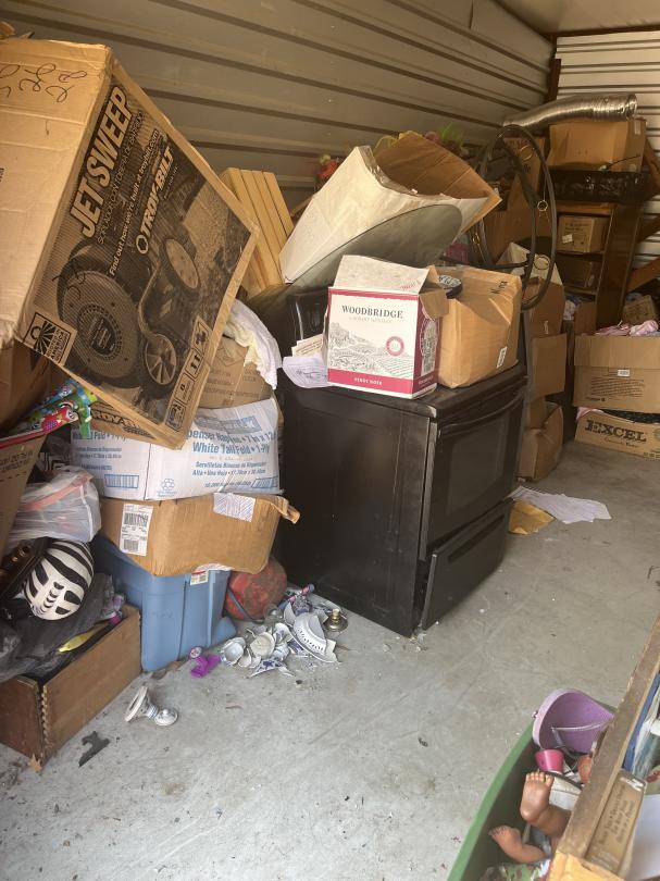 This unit appears to contain…Drive-Up Storage boxes, totes, stove, walker, 2 TVs, quilt rack, shoes, misc. stuff, toys, pictures, mirrors, fan, gun cases, stereo, chair