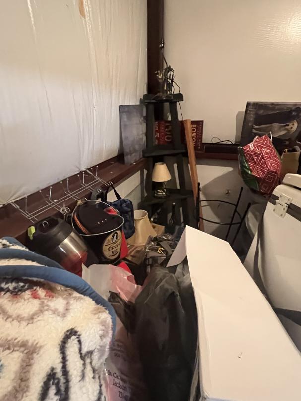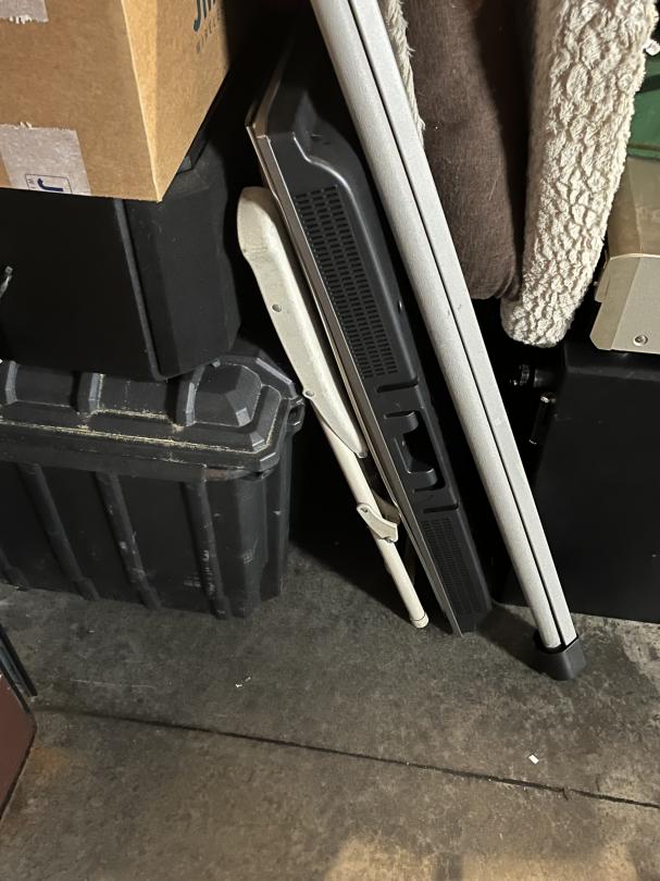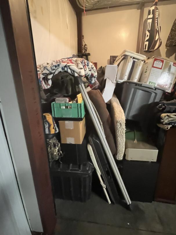 This unit appears to contain…Climate Controlled First Floor totes, clothes, corner shelf, golf bag, stereo speaker, coolers, TVs, walker, fishing tackle bags, dog beds. Christmas tree, kids riding tractor w wagon..