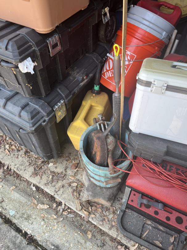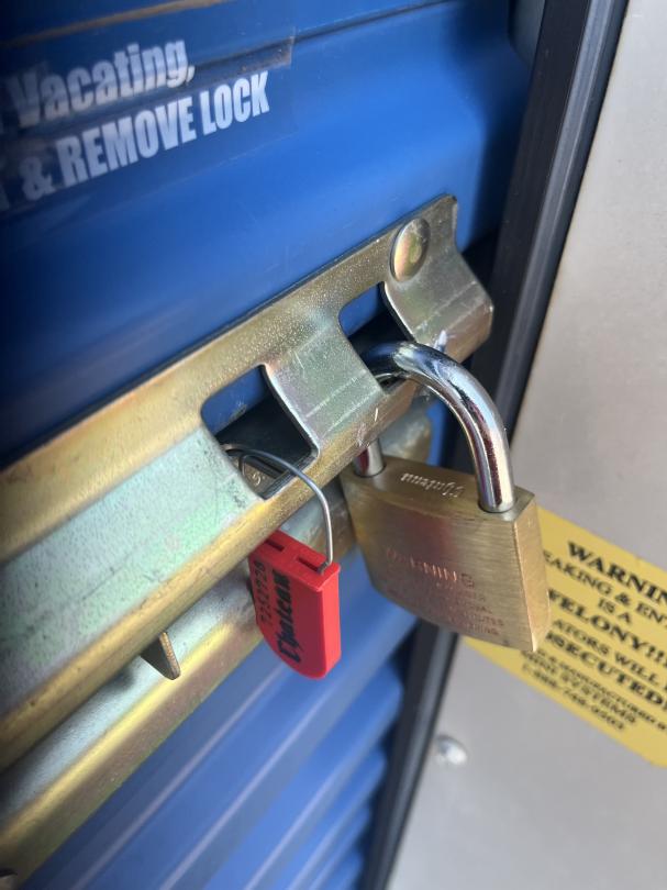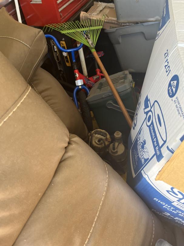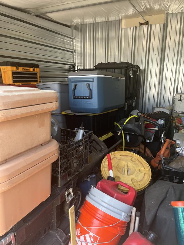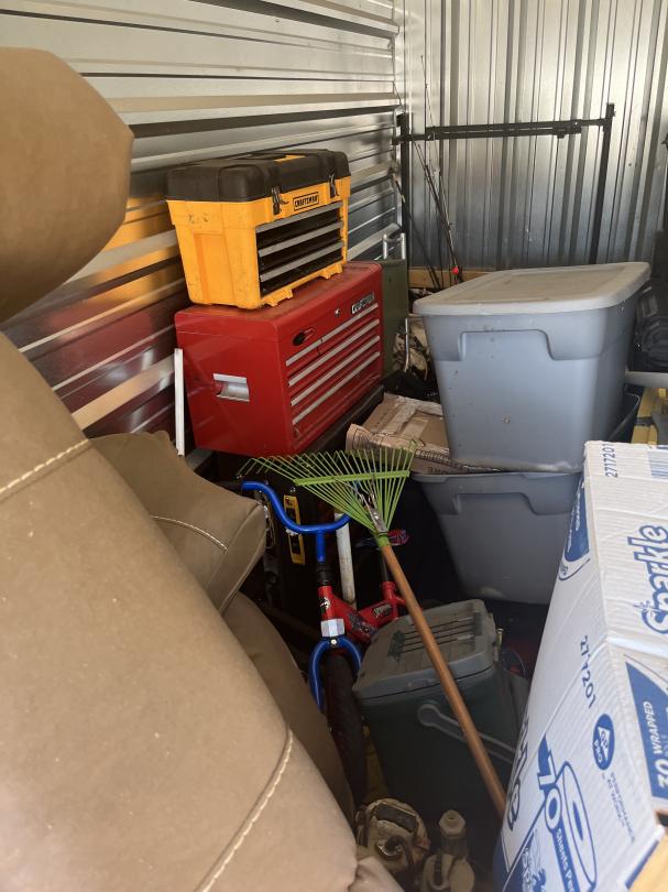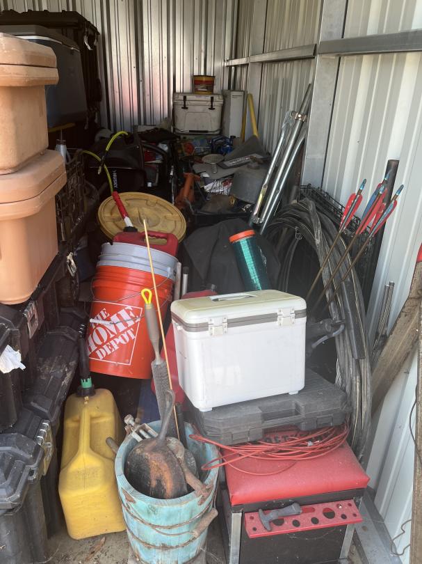 This unit appears to contain…not climate-controlled unit toolboxes, coolers, couch, trailer Toung, water hose, work stool, gas jugs, rake, kids bike, work cart, roll up air hose, quid wire, fishing poles.