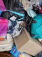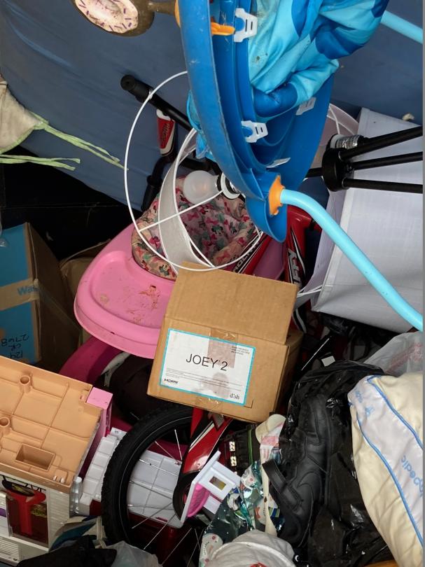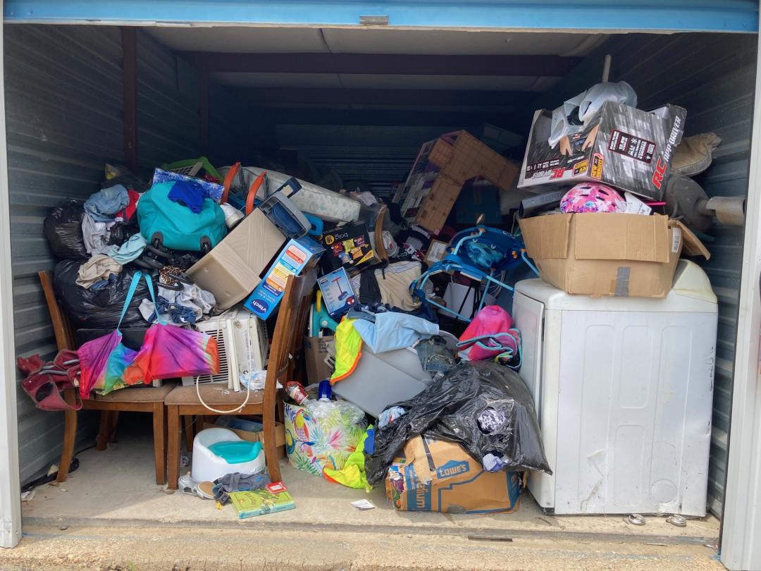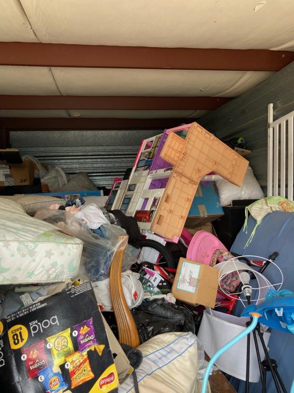 This unit appears to contain…Drive-Up Storage - Dryer, totes, doll house, baby bed, baby walker, window ac, microwave, chairs, mattress, dresser, bicycle, lamp, table, bags