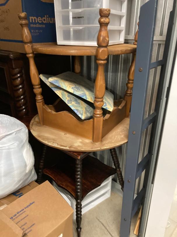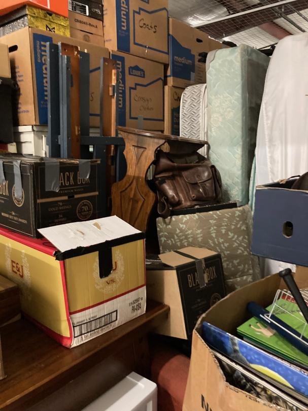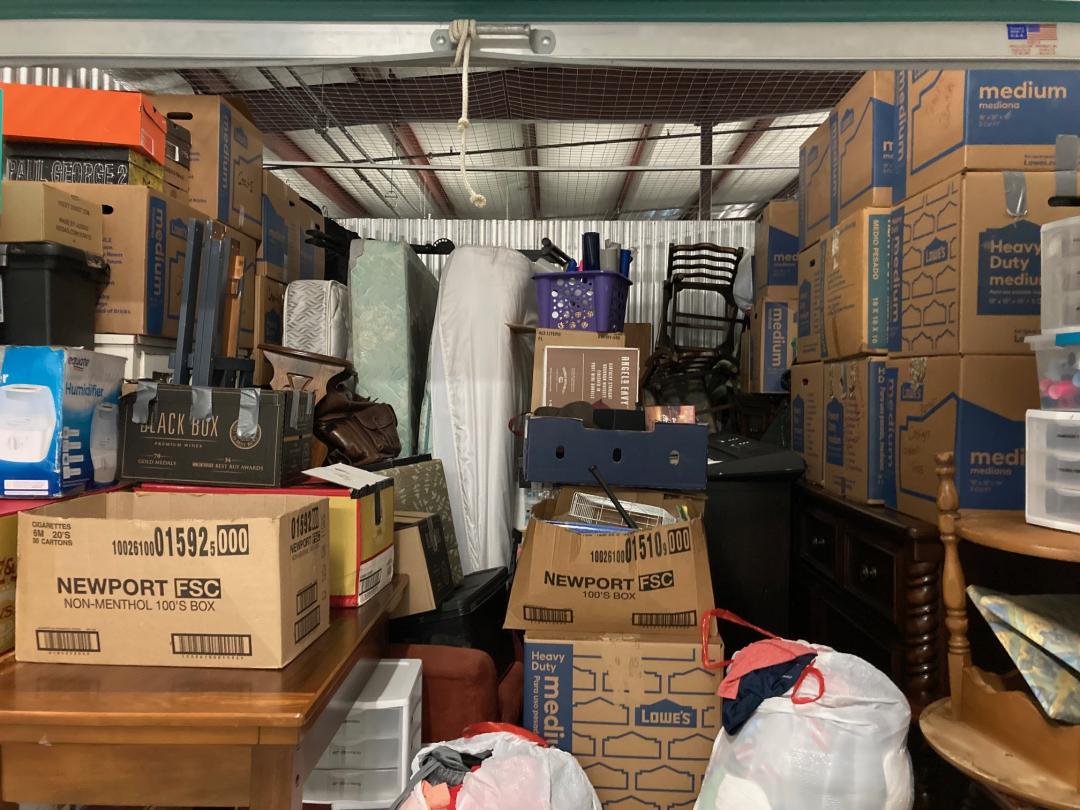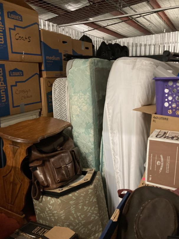 This unit appears to contain…Climate Controlled First Floor - keyboard, dresser, end tables, chairs, boxes, desk, boxes, plastic organizers, clothes, mattress & box spring, chest of drawers, accent tables