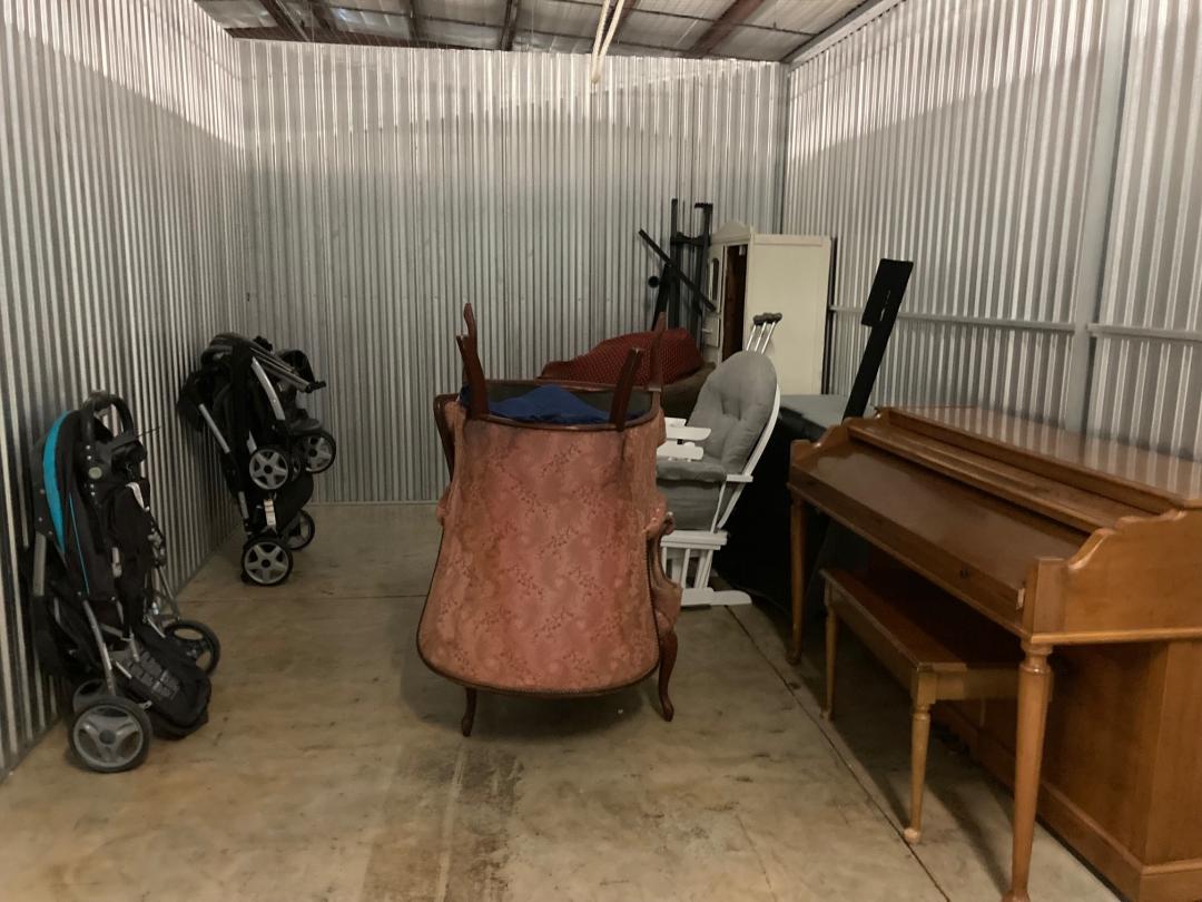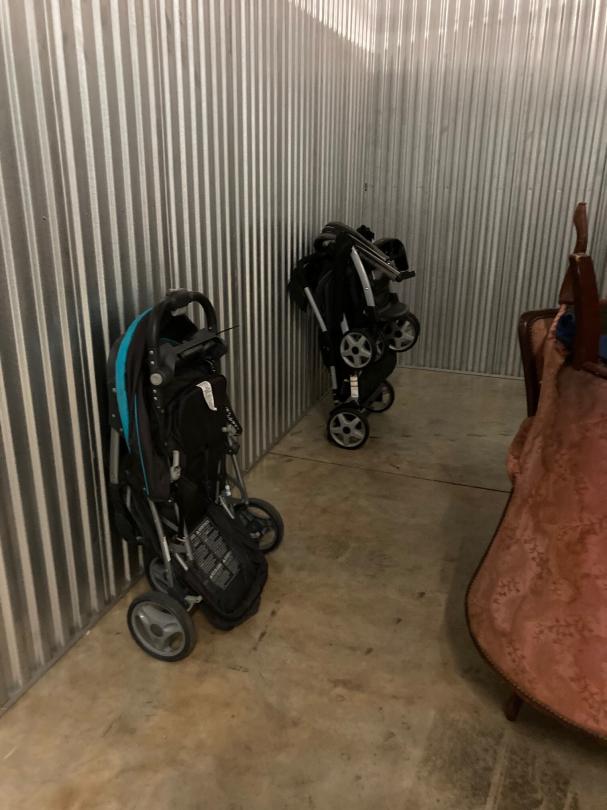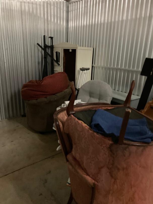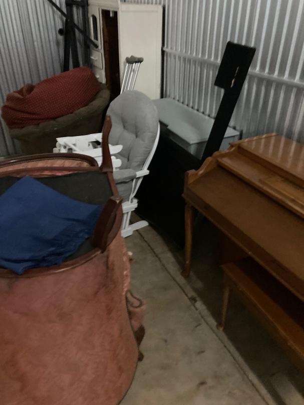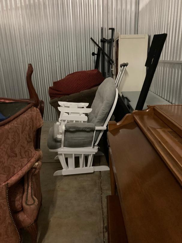 This unit appears to contain…Climate Controlled First Floor - piano & bench, sitting chairs, bean bag, bed rails, double stroller, stroller, rocker glider & ottoman, cabinet, vanity