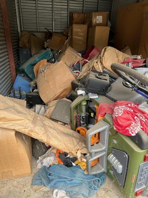 This unit appears to contain…Bed Frame, Totes, Bicycles, Household Items