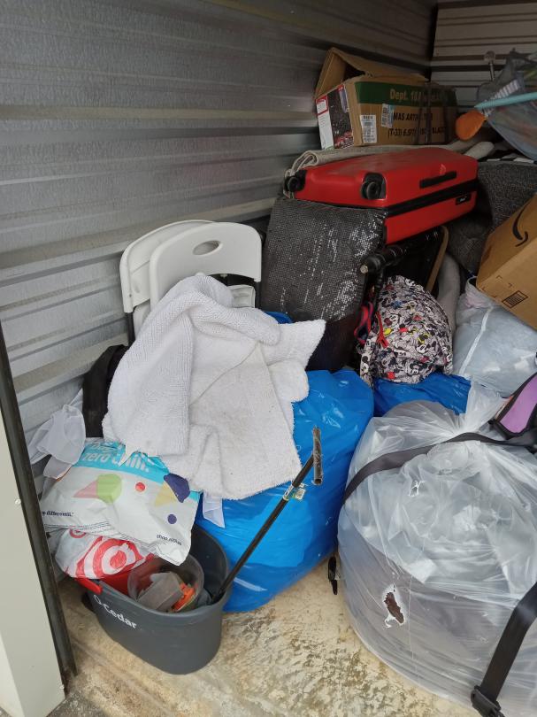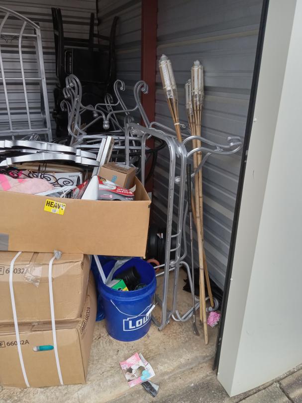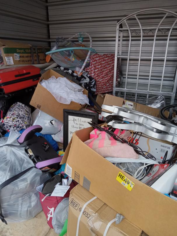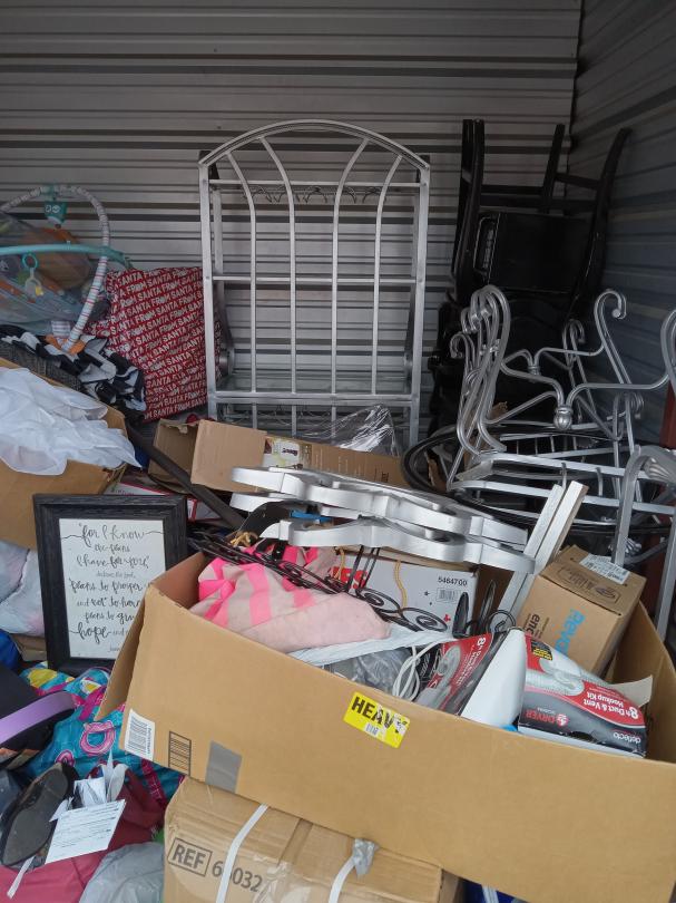 This unit appears to contain…tables and chairs, playpen, rugs, car seat, luggage, asst. decorations, baker's rack, clothes, shoes, boxes