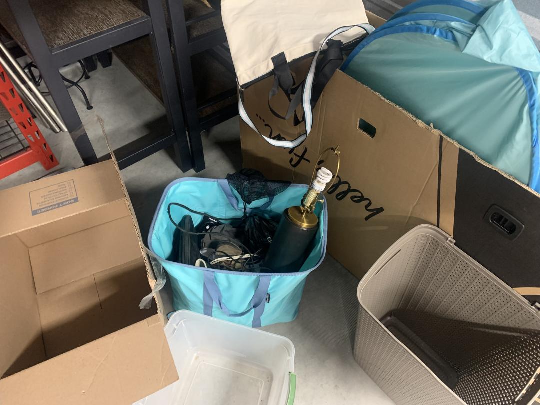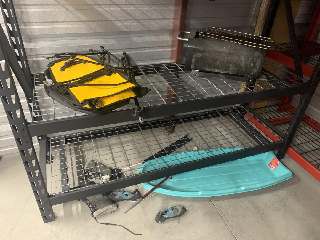 This unit appears to contain…Standing Shelves, Lamp, Bed and Bed Frame, Sled, Thermos, Dog Carrier