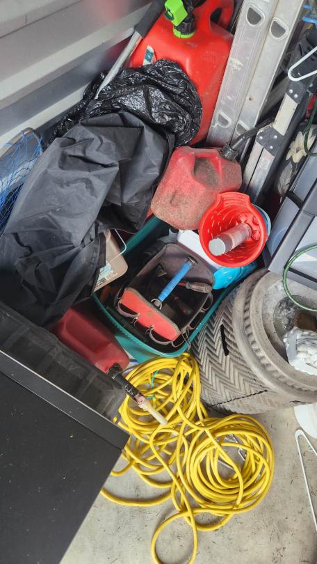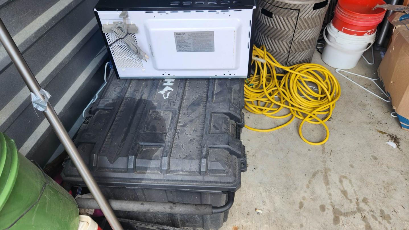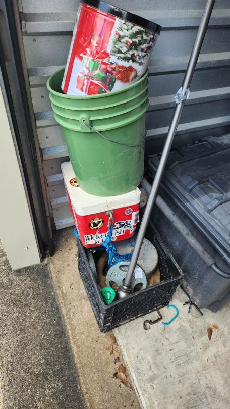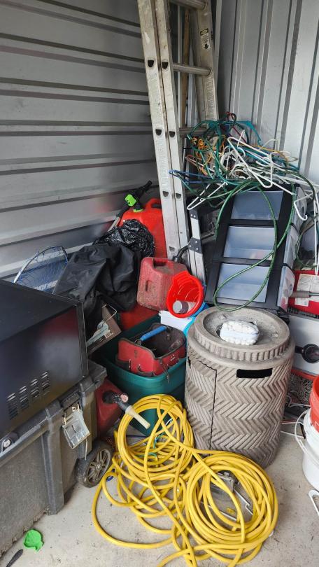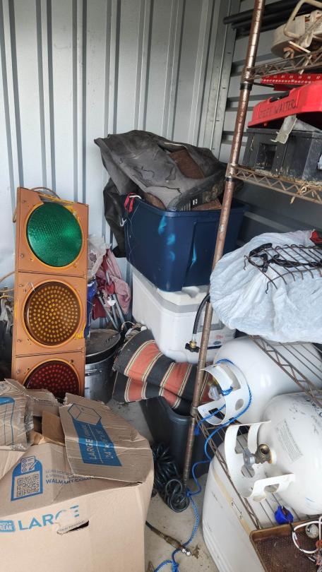 This unit appears to contain…microwave, tools, tool box, fishing items, ladder, shelf, totes, RC Boat, 5 gal buckets, ice chests, traffic light, boxes, life jacket.