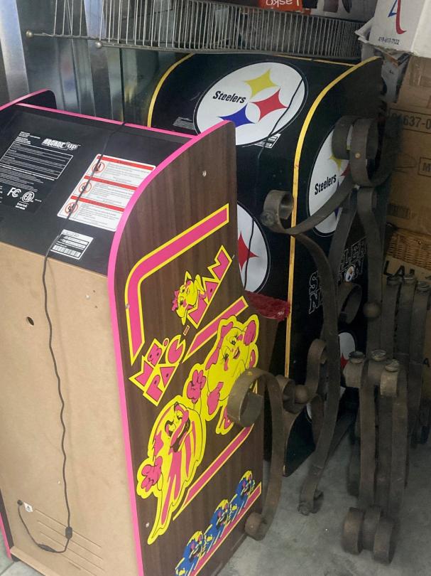 This unit appears to contain…Mini arcade games (two total) Movies Artwork Rugs Boxes
