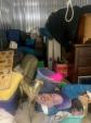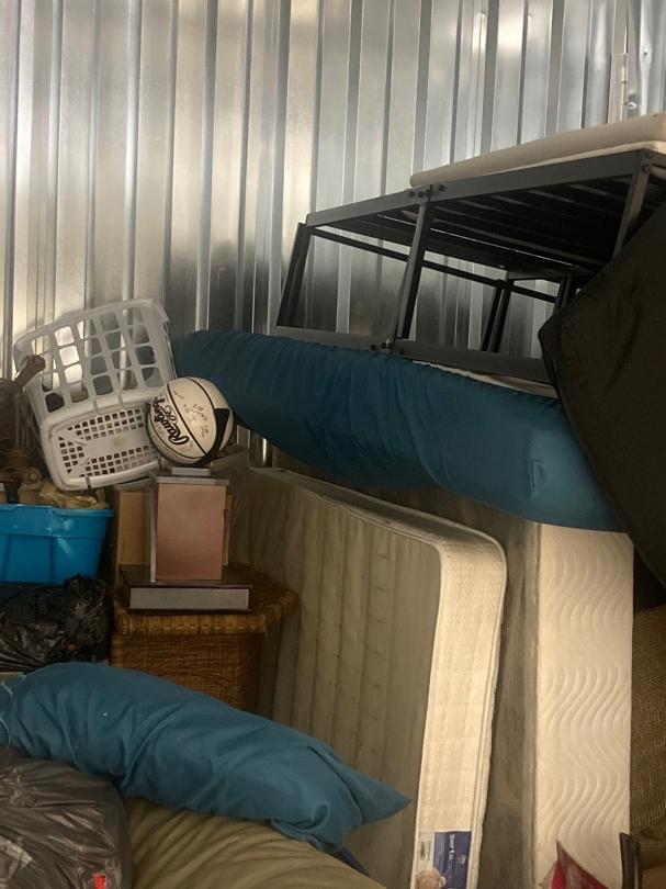 This unit appears to contain…Picture frame Gold dog DVD player Plastic totes Bed Dresser Crutches Dolls Gaming Chair
