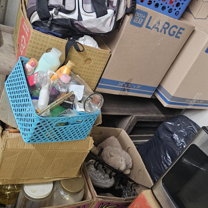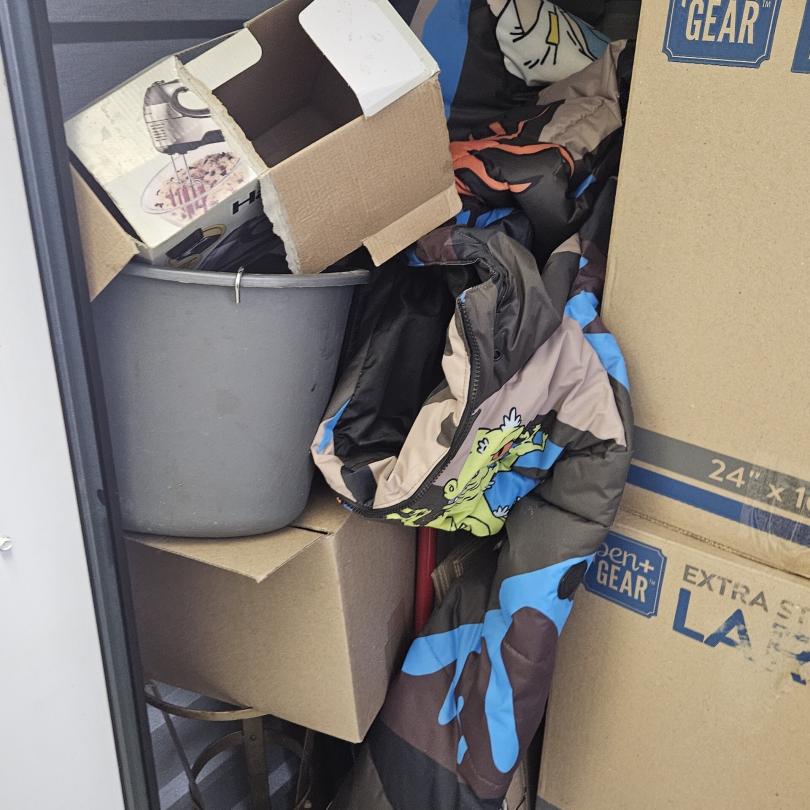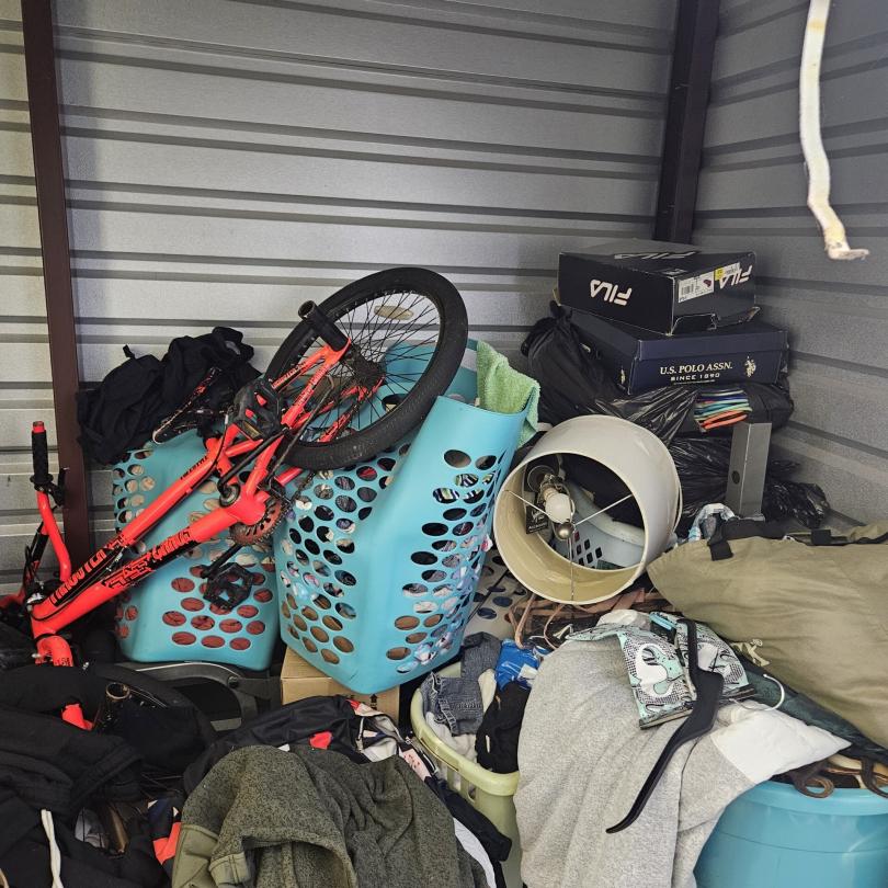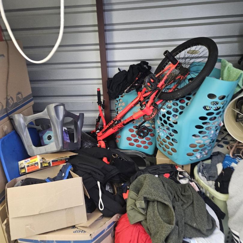 This unit appears to contain…Bikes,Chairs,Decor,Plastic bags,Plastic containers,Misc. Boxes, Clothing, Sports Gear,Laundry Baskets, Cleaning Supplies, Misc. Items.