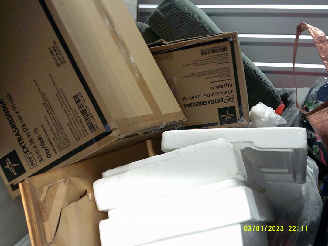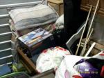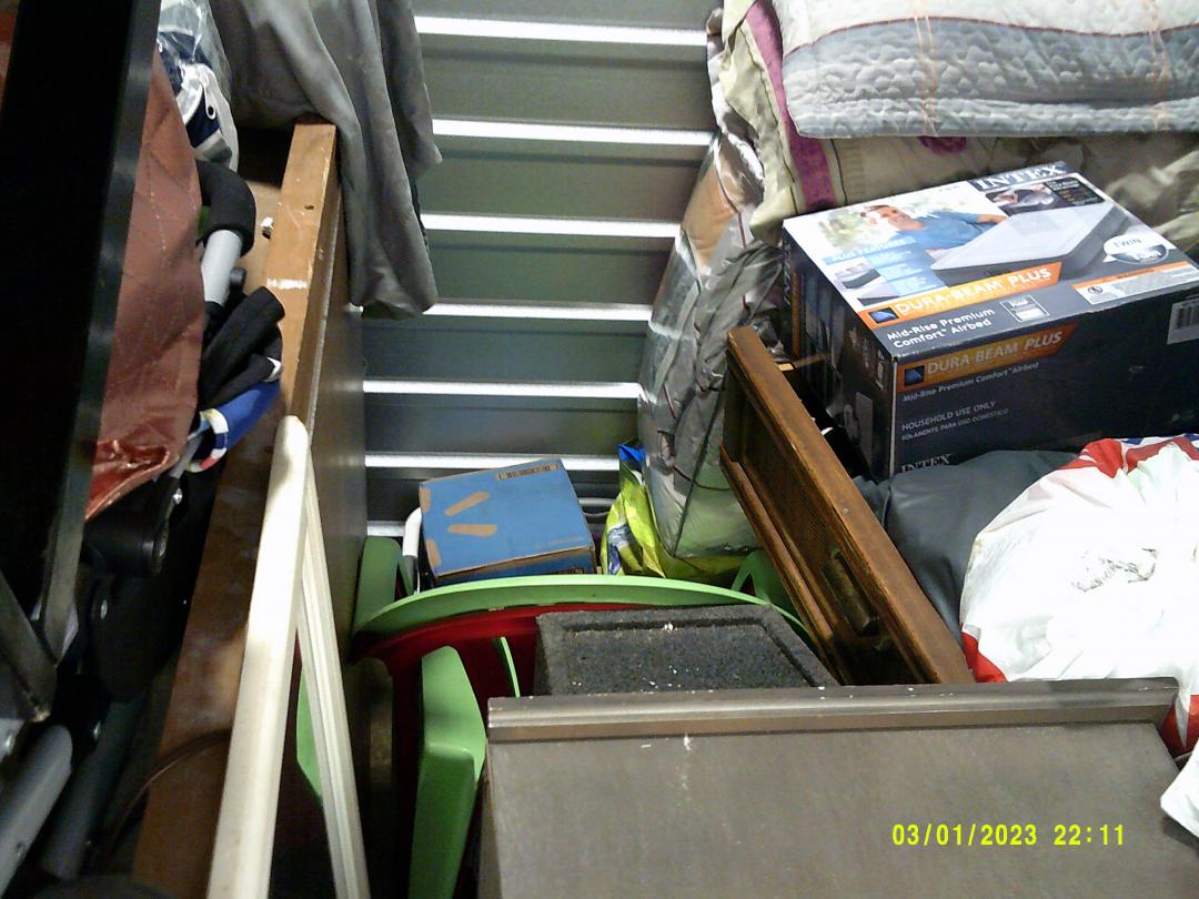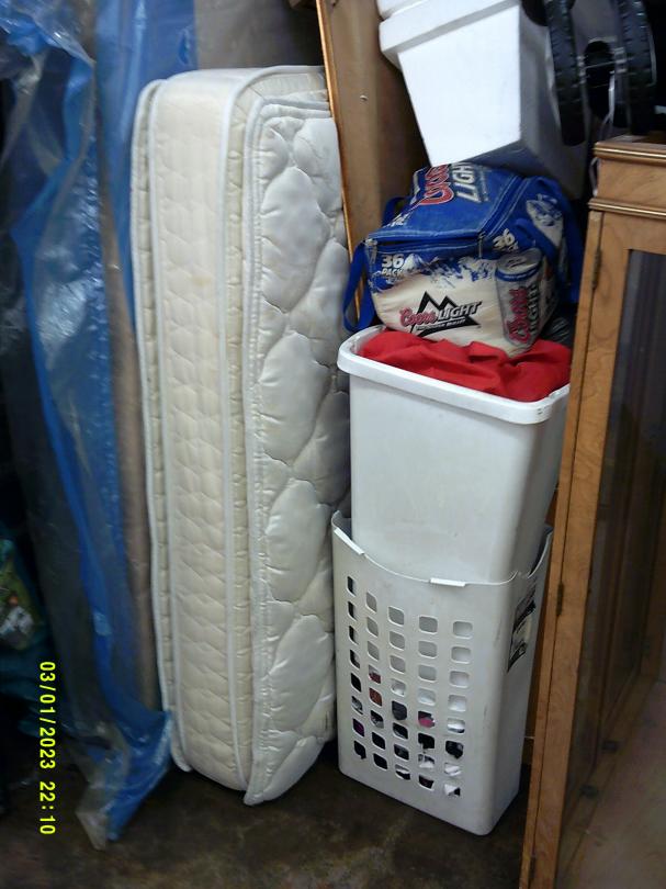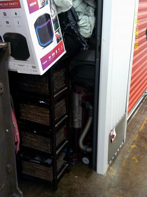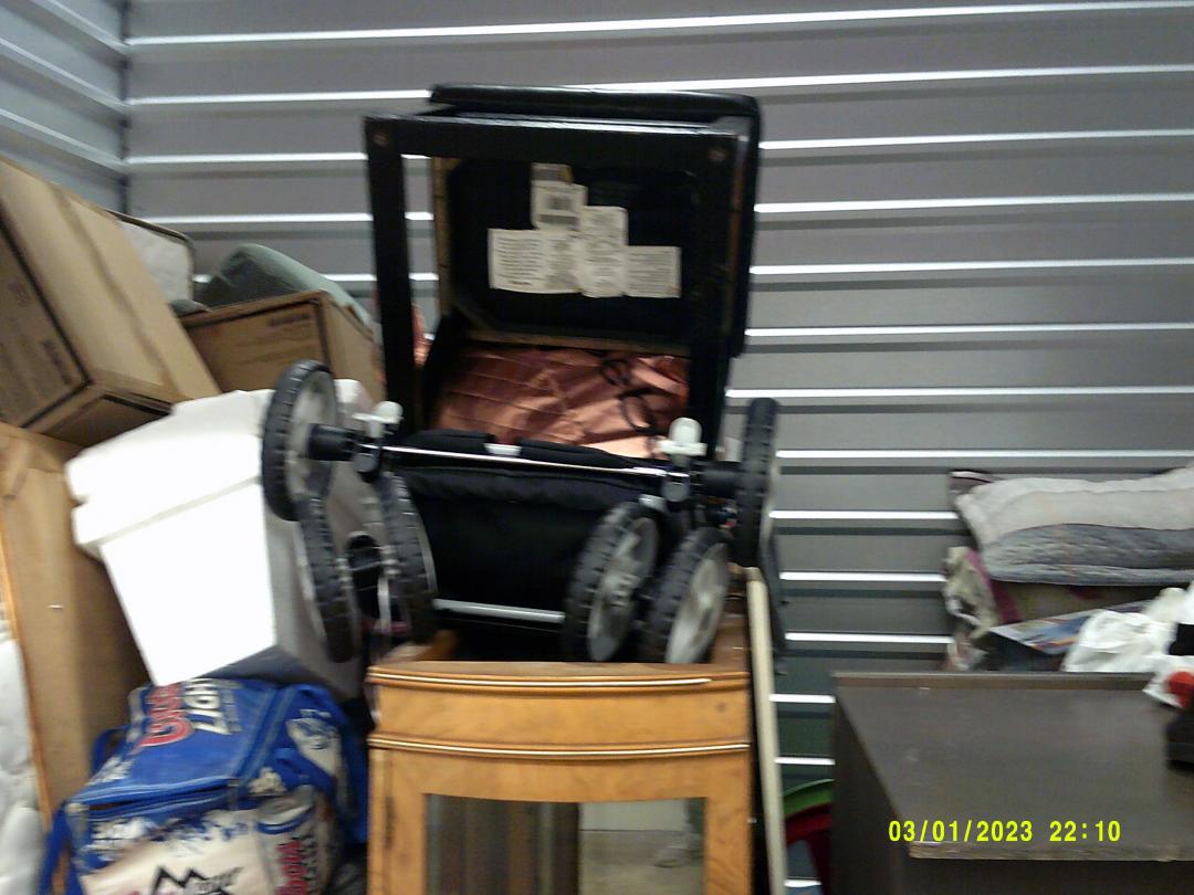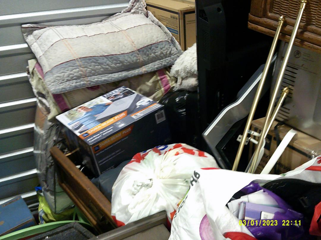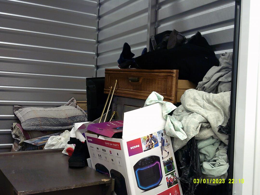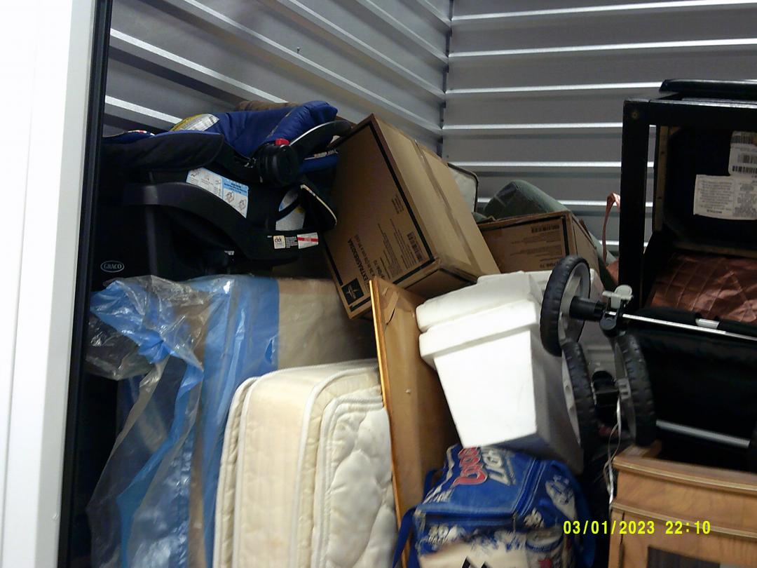 This unit appears to contain…READ ALL AUCTION RULES BEFORE BIDDING!!! Unit appears to contain: Wicker shelving, mattress, boxes, child carrier, bags, nightstand, pillows, furniture, microwave