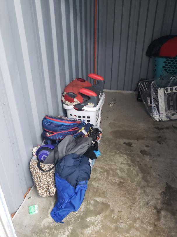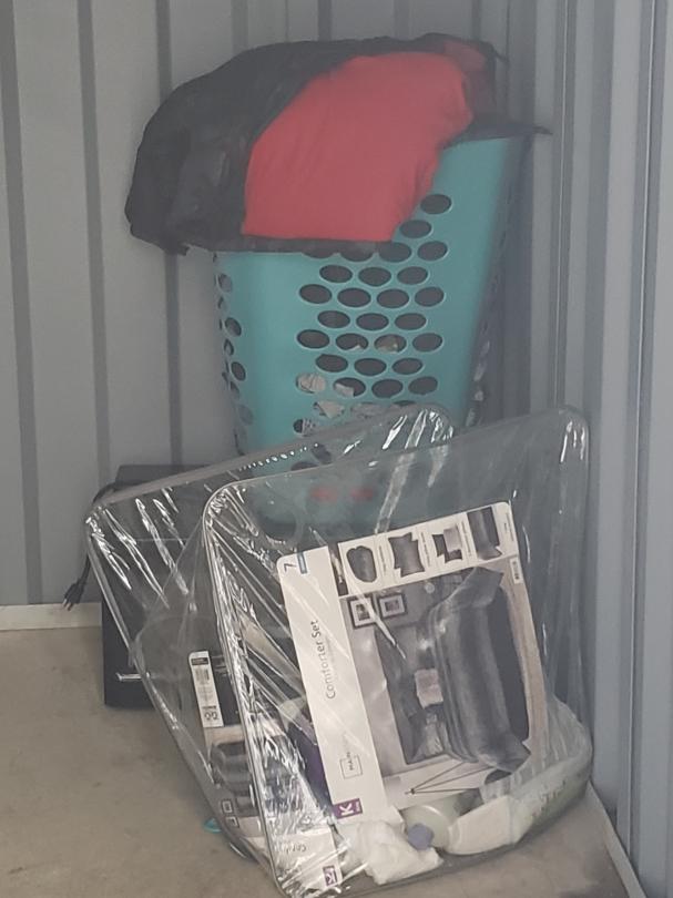 This unit appears to contain…Booster seat, back pack, laundry hampers, clothing, microwave