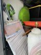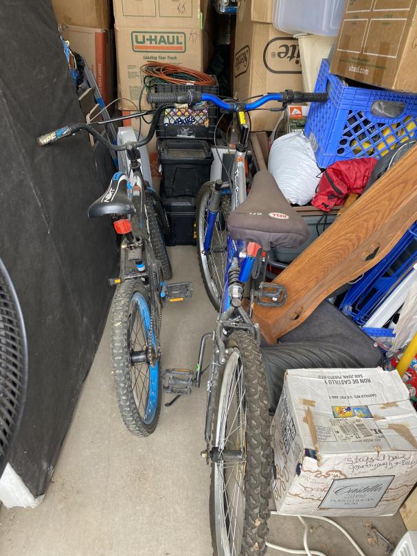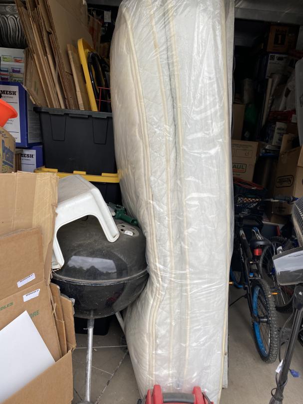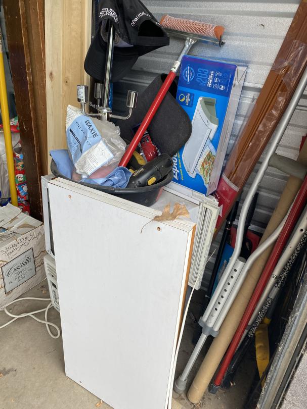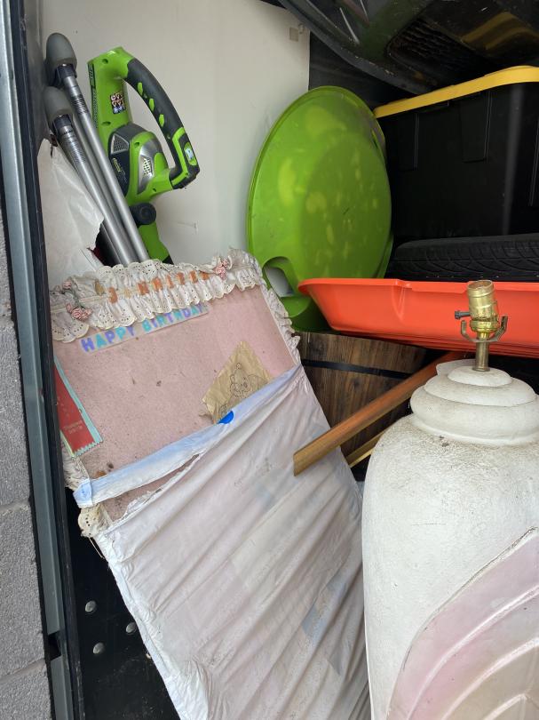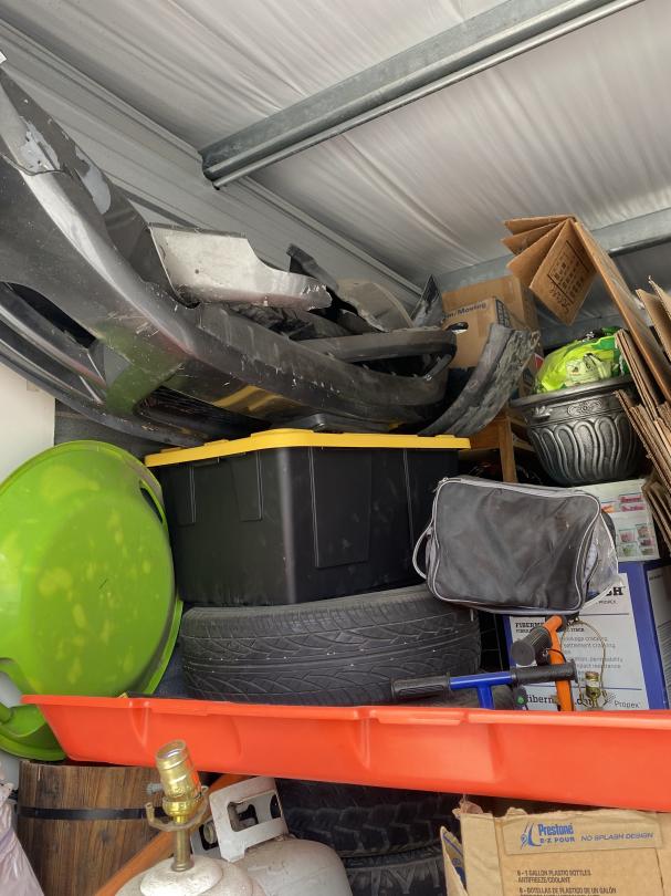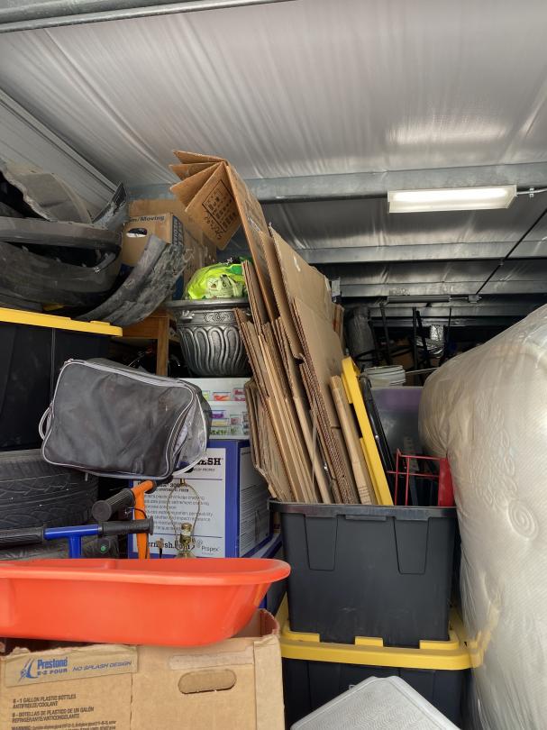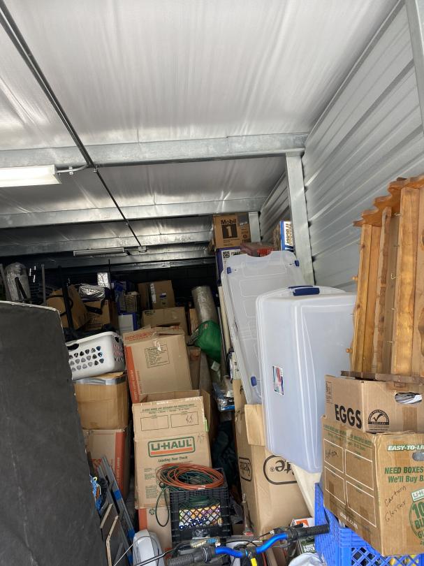 This unit appears to contain…Fishing poles, car parts, tires, lamp, planter, end table, grill, shop vac, AC units, Childs Bikes, fans, Jump box, mattress, boxes, bins, step stool, bowling ball, Area rung, furniture