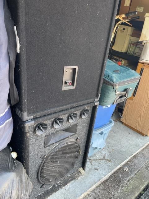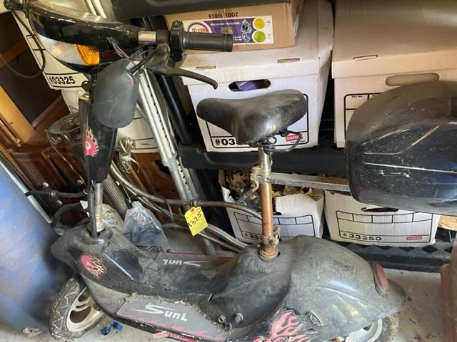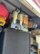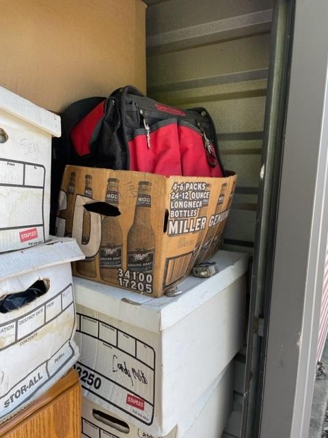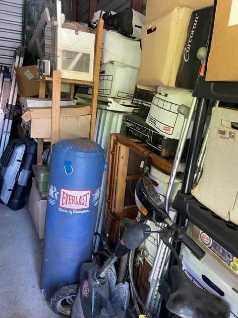 This unit appears to contain…This is a packed from top to bottom unit. It appears to contain tools, workout equipment, large speakers, ladders, door, mini fridge, glassware, fishing boat, vintage large bird cage, various auto accessories, tires, motorized bike/scooter.