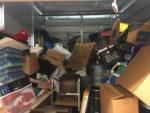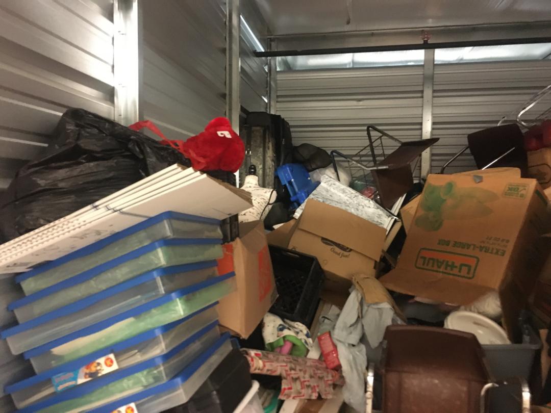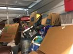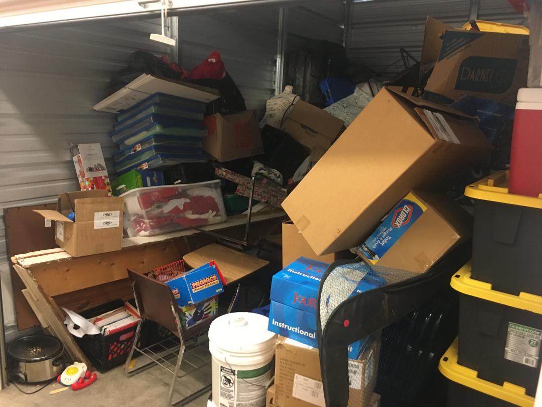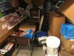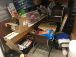 This unit appears to contain…Misc Totes, MIsc Boxes, 4 School Desks, Cricut Printer, CDs, Computer Tower, Cooler, Baby Stroller, 6 Folding Chairs, Misc Baby Toys, Mannequin, Books, Misc School Supplies, Multiple Headphones, Crock Pot