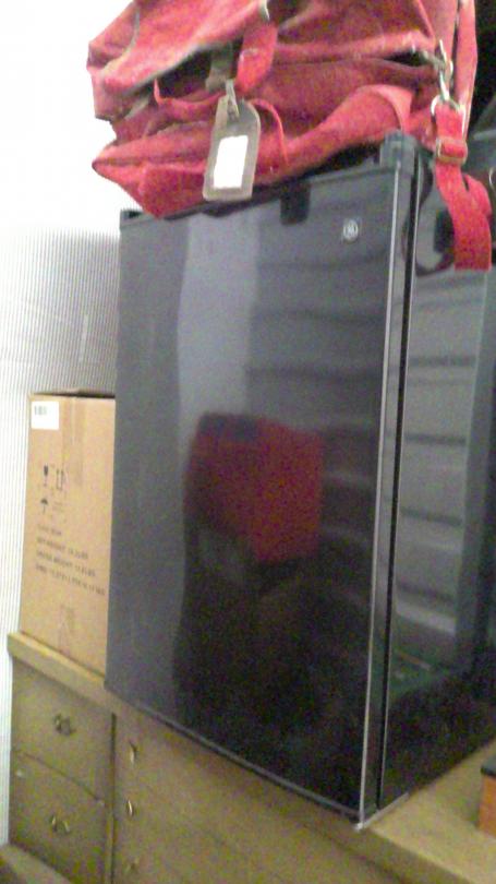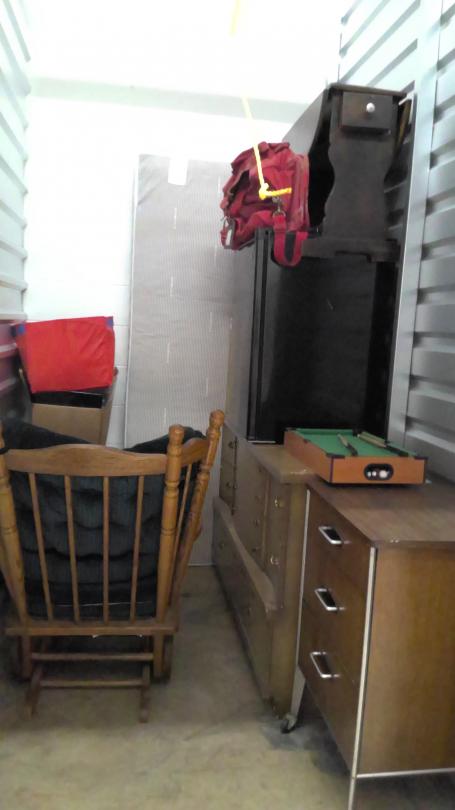 This unit appears to contain…Chair dresser cabinet mini pool table mini refrigerator old small table boxes and tubs