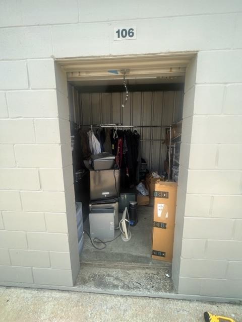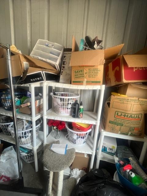 This unit appears to contain…Flat Screen TV, 2 mini frig, Shelving, Computer, Printer, Clothes