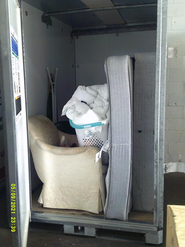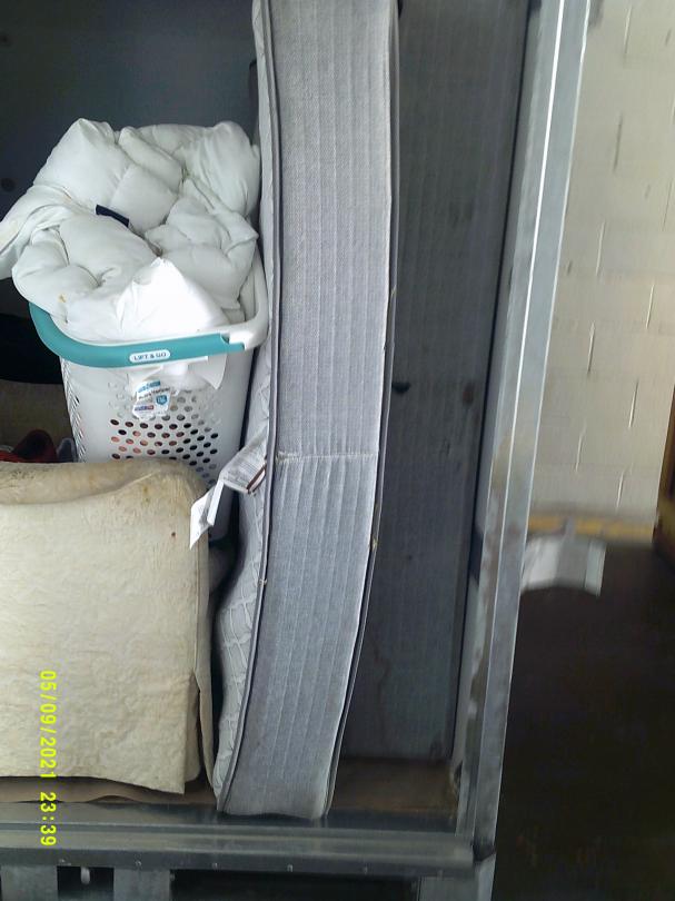 This unit appears to contain…READ ALL AUCTION RULES BEFORE BIDDING!!! Unit appears to contain: Box Spring, mattress, chair, sneakers, bags, comforter
