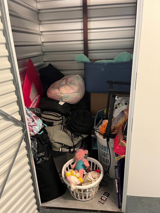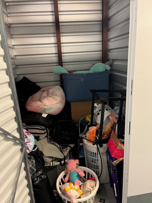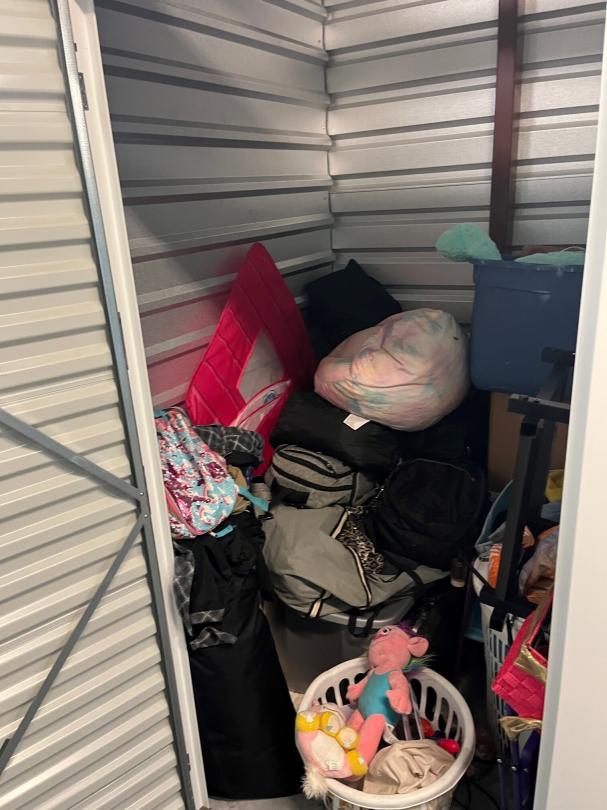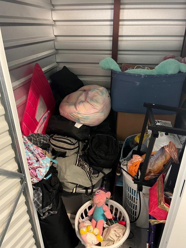 This unit appears to contain…boxes, bags, clothes, kids toys, stuffed Animals, totes