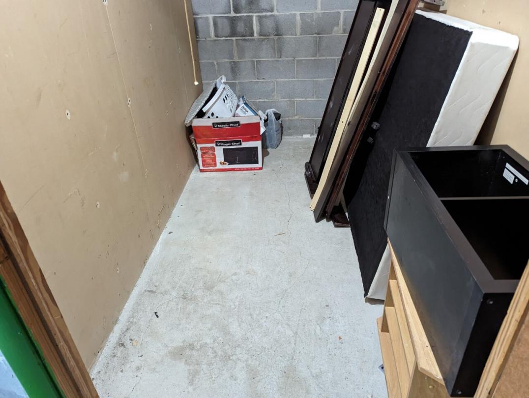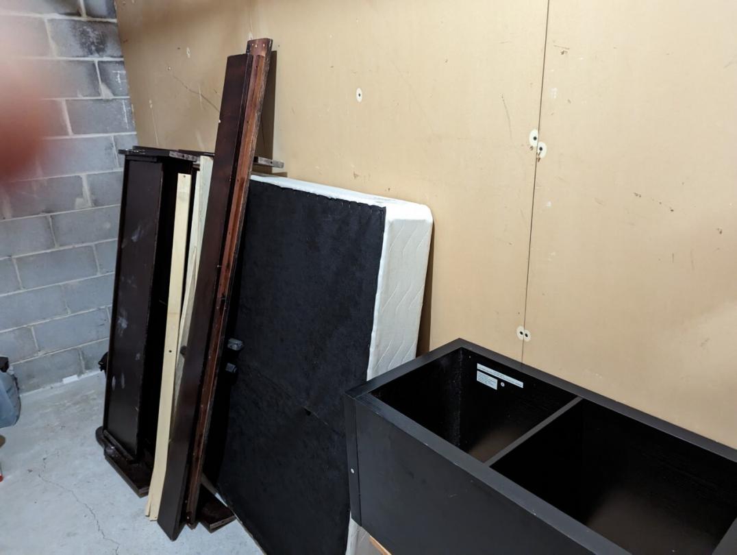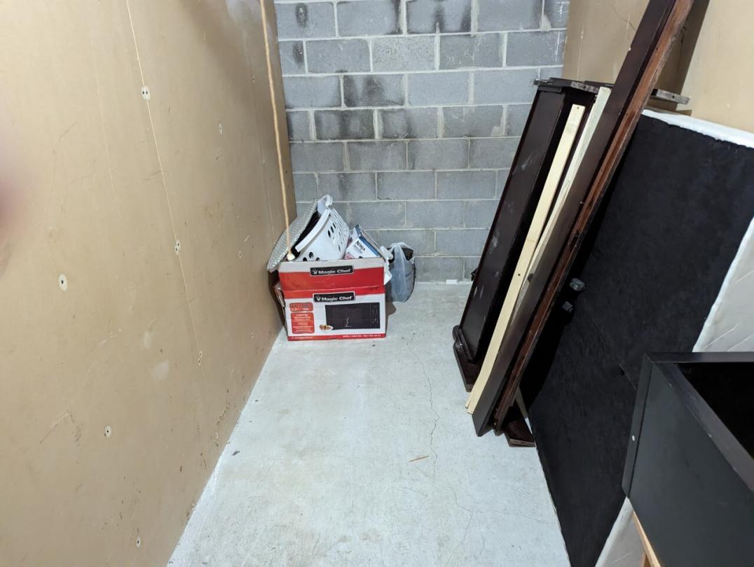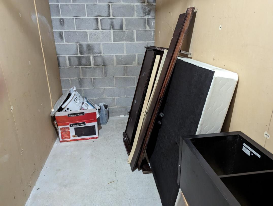 This unit appears to contain…unit appears to contain: shelving, box springs, nightstand, plastic containers, misc. boxes, headboard
