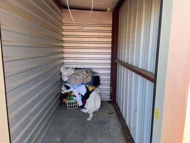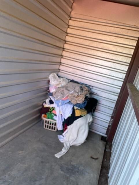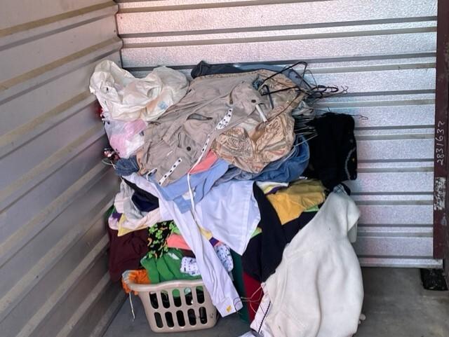 This unit appears to contain…Plastic Bags,Clothing,Misc. Items,Laundry Baskets