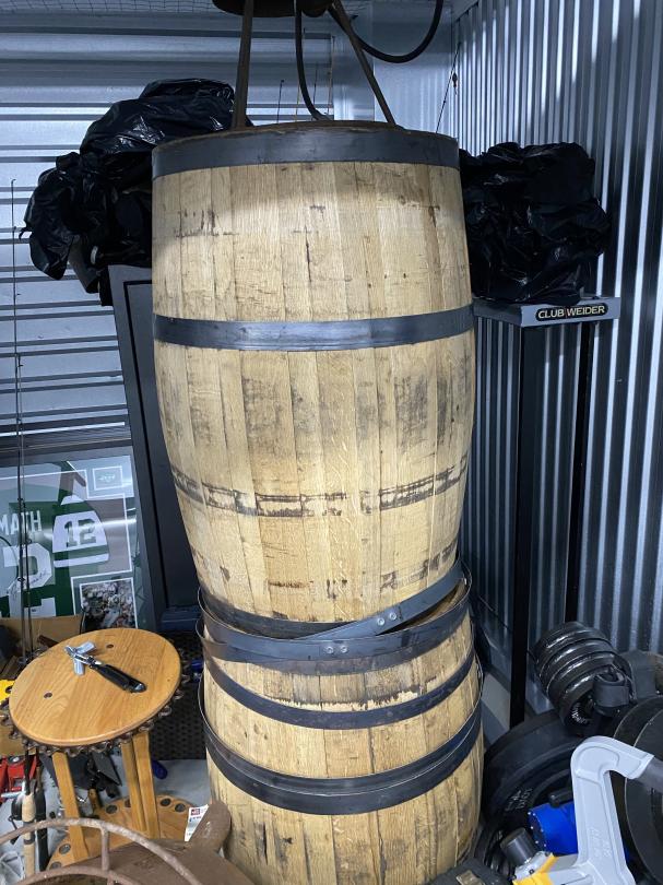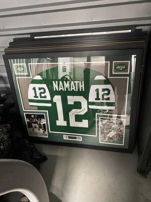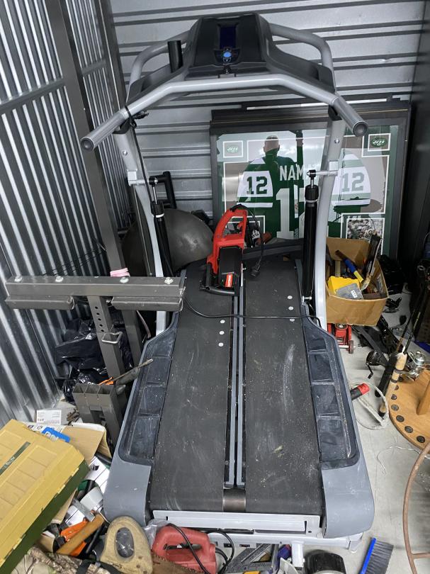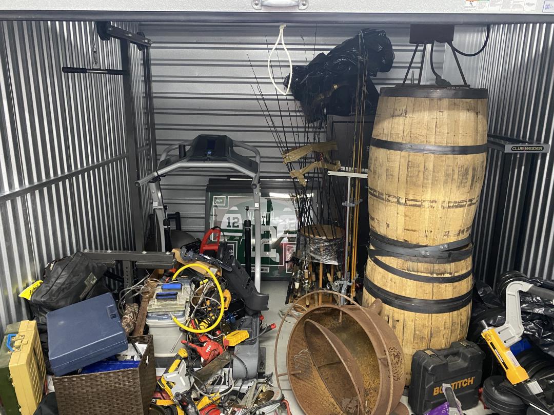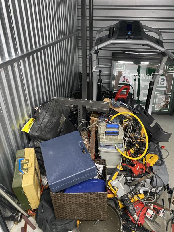 This unit appears to contain…12 Signed jerseys by Pro football players they are certified. Joe Namath, Earl Campbell, Ron Jaworski, Marcus Allen ,Kirk Warner, Marcus Allen can't remember the rest. Stair stepper, Wiskey barrels assorted tools, Dutch oven's, flooring tools, Lat pull down Fire pit, fishing rods, miter saw, hardwood floor Nailer,
