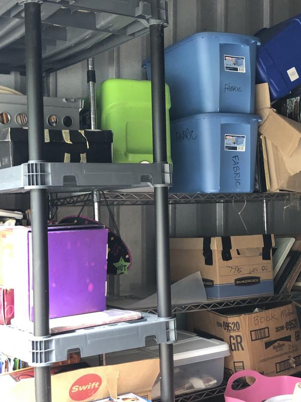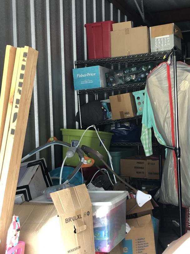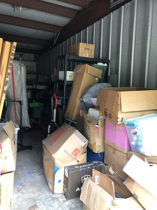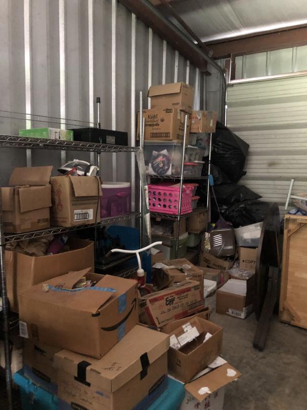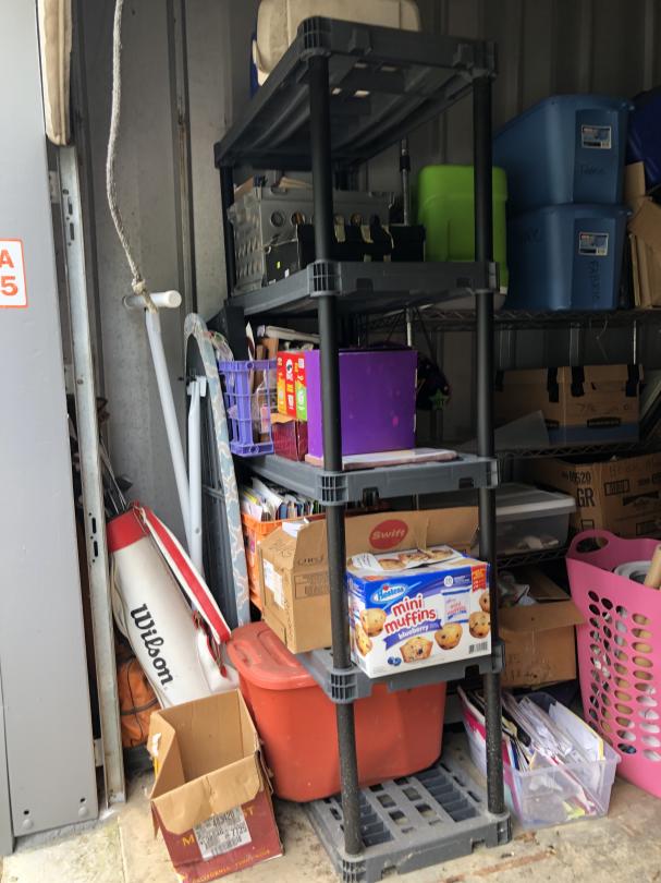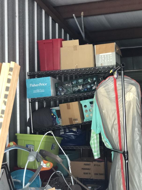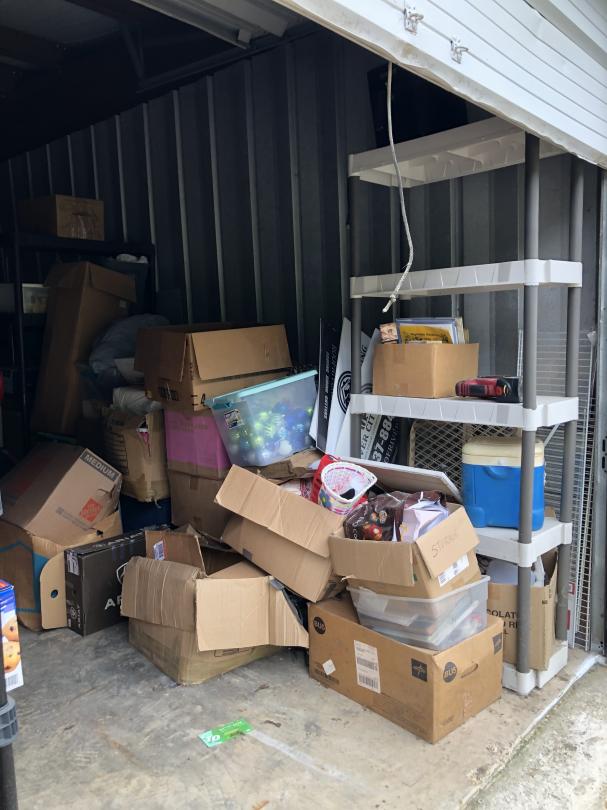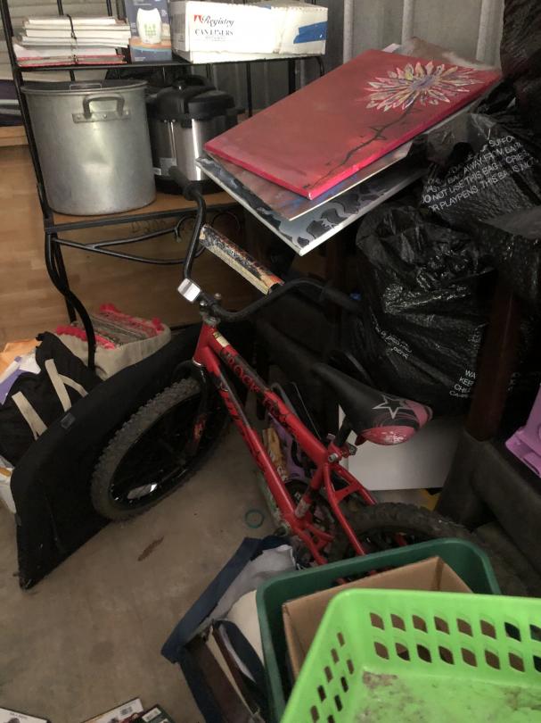 This unit appears to contain…Bike, vacuum, ice chest, sewing material, boxes, ornaments, jigsaw, books, shelving.
