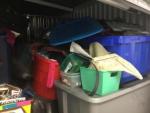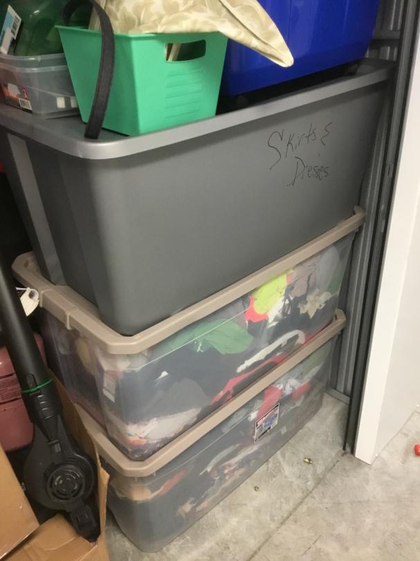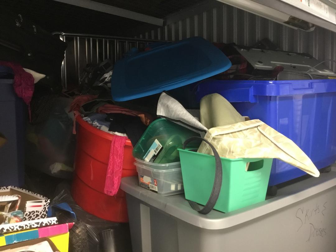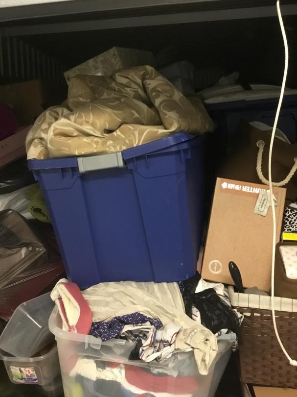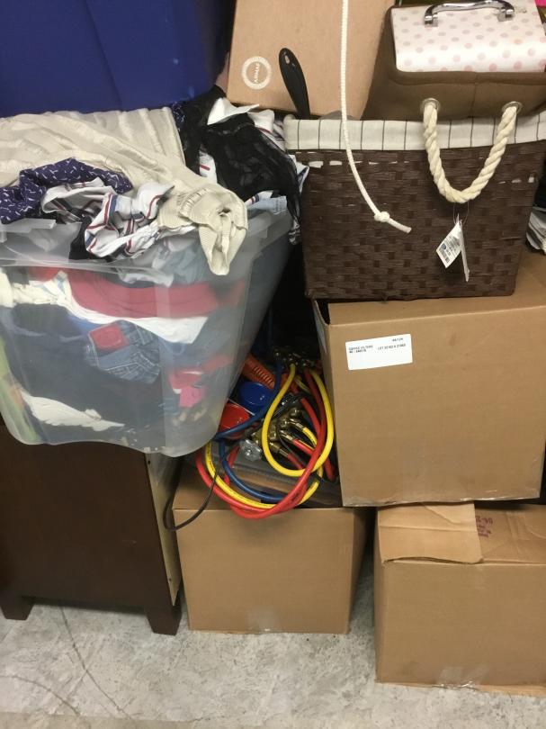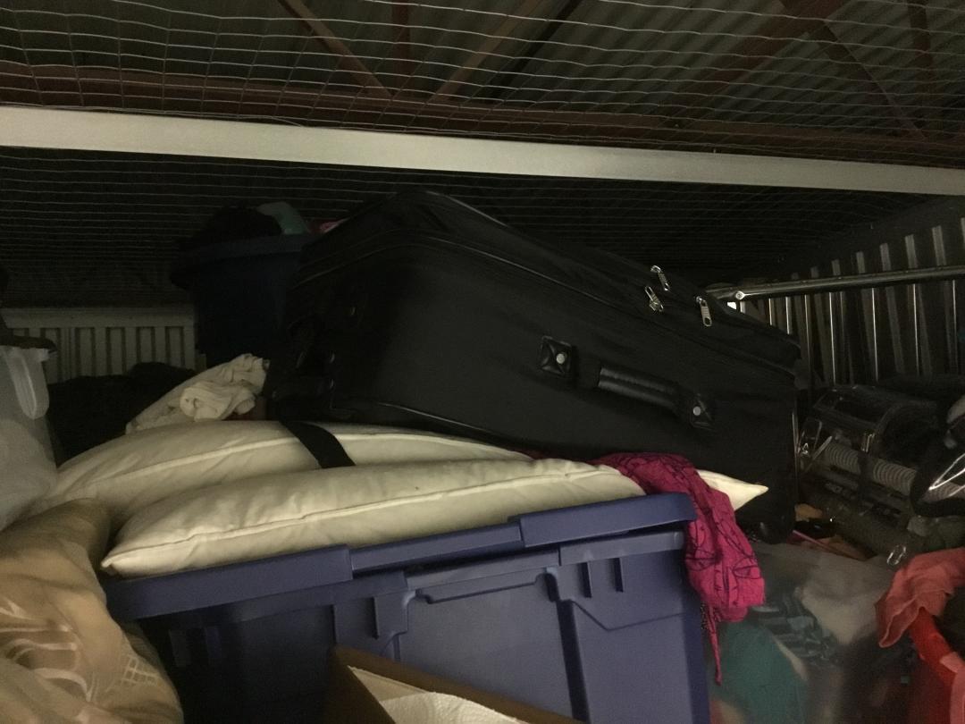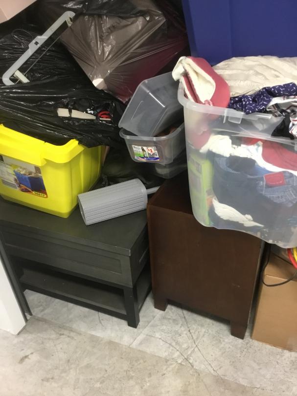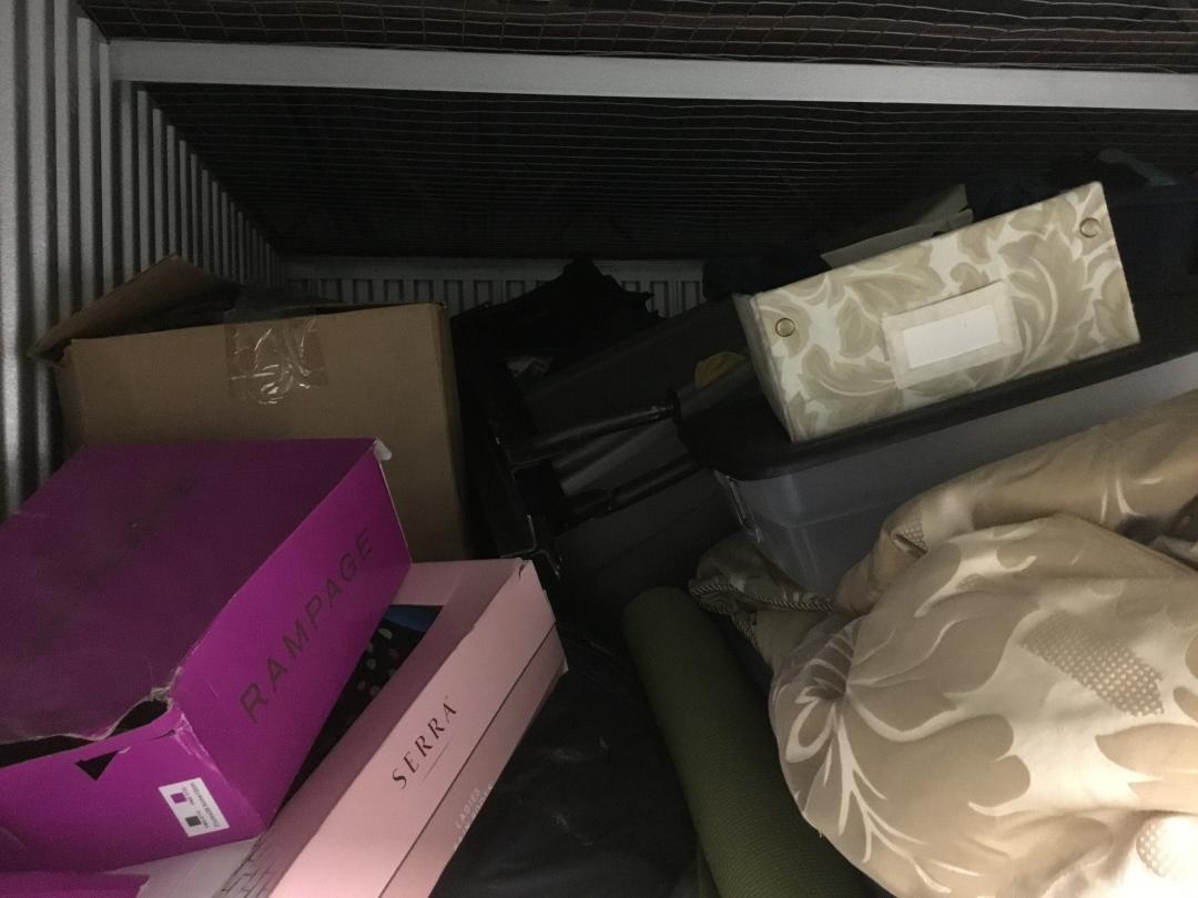 This unit appears to contain…HVAC equipment, end table, coffee table, clothes, bins, shoes, suitcase, metal rack