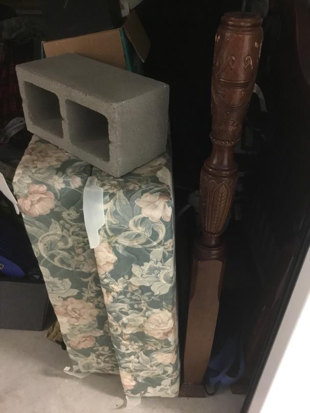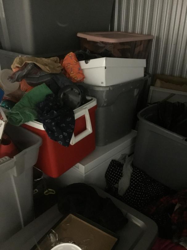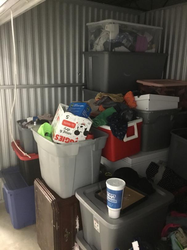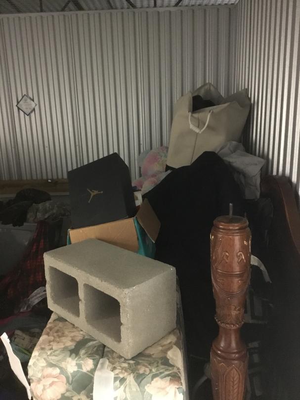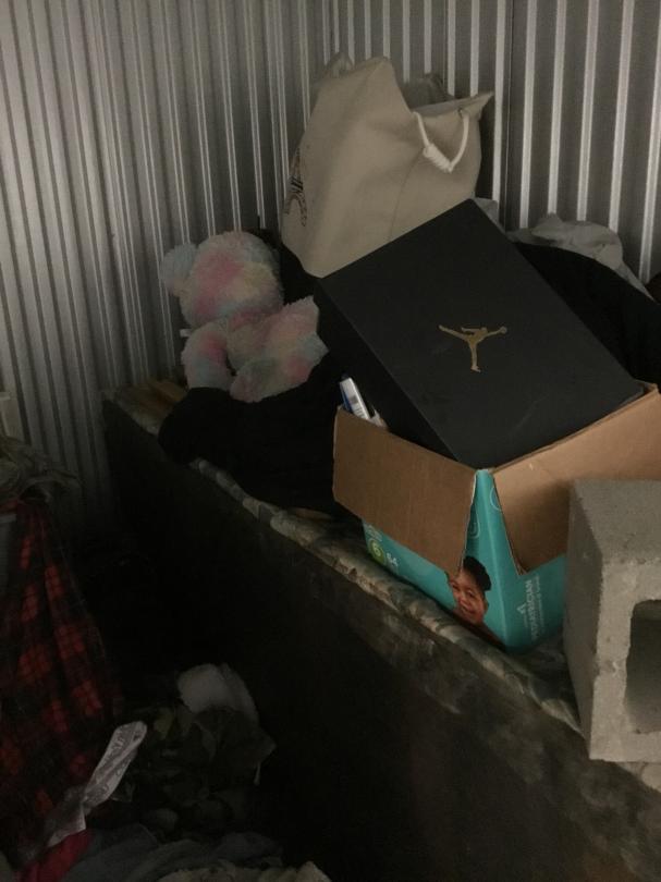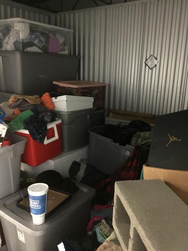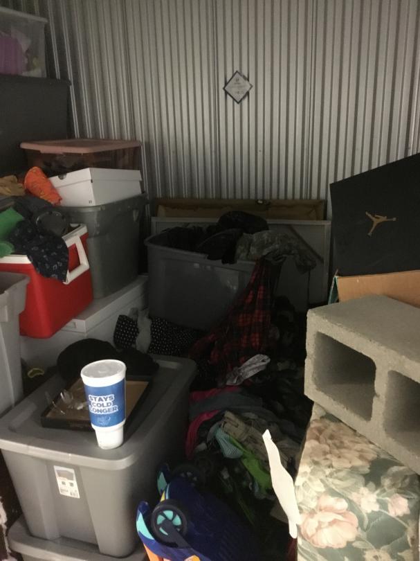 This unit appears to contain…box spring, bed frame, totes, bed side table, deep freezer, pictures, cooler, clothes