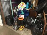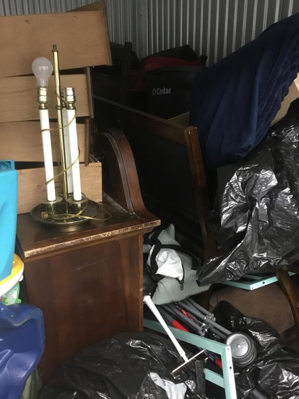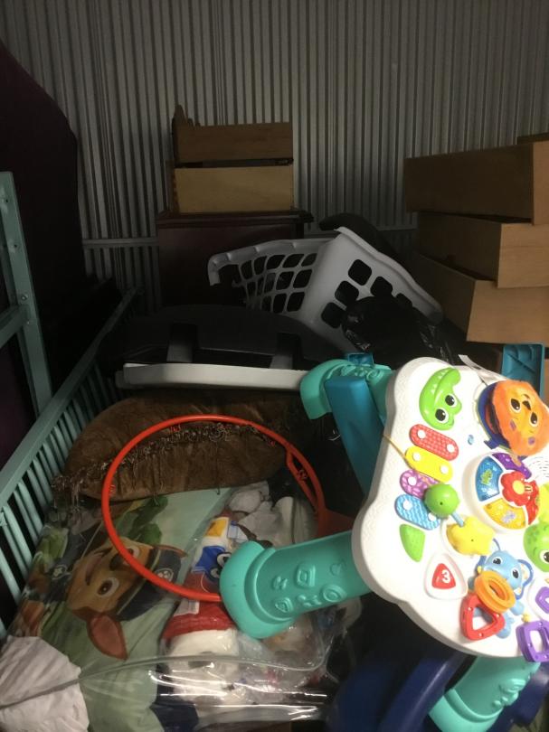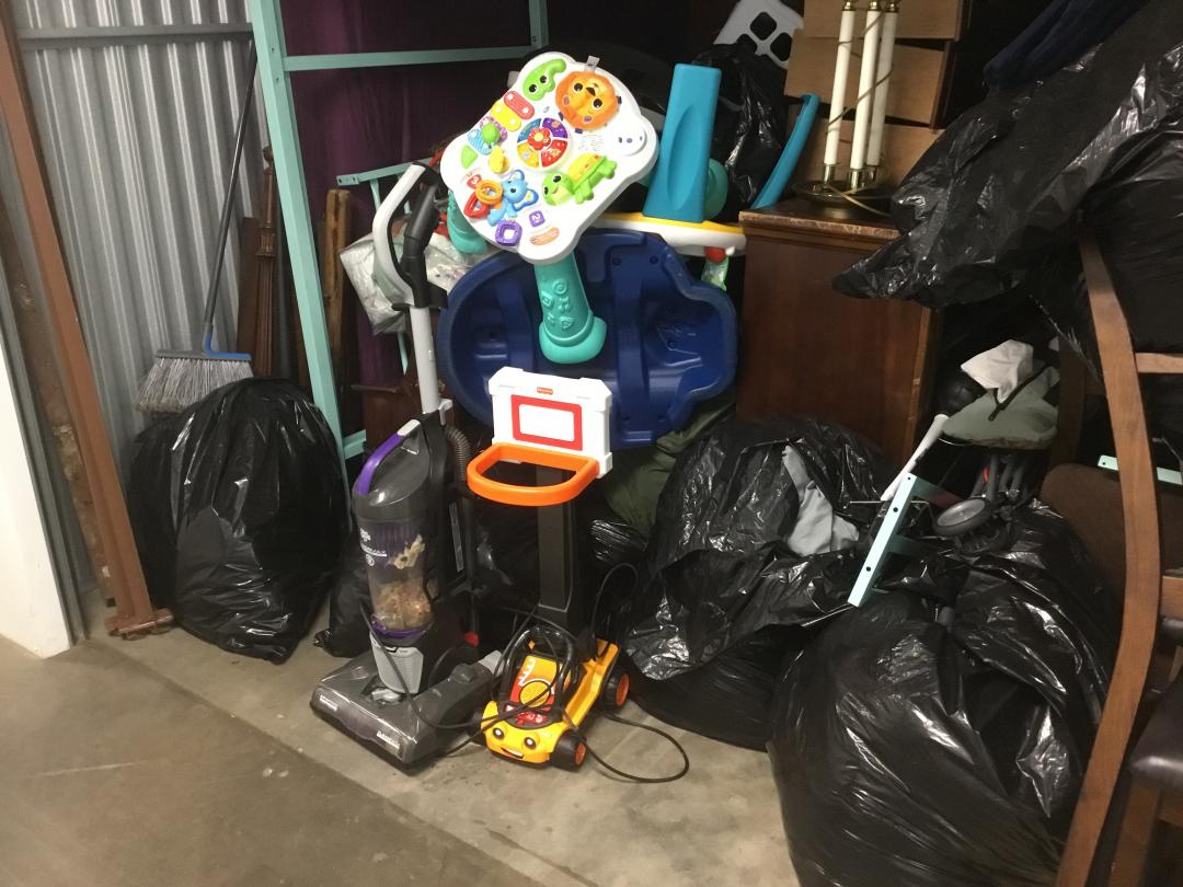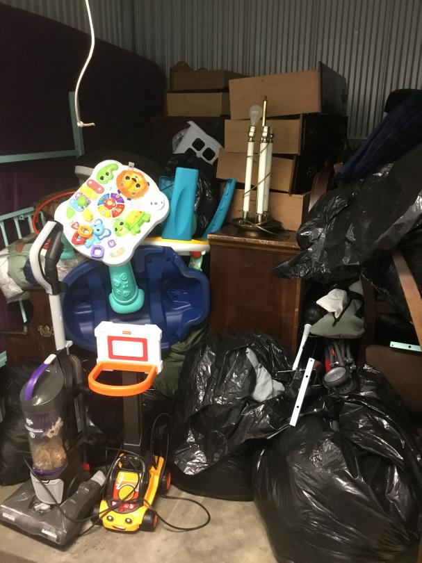 This unit appears to contain…mattress, stroller, dresser, kids toys, lamps, couch, vacuums, bags