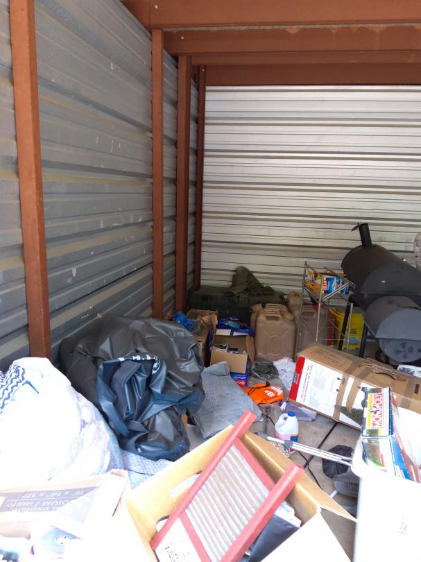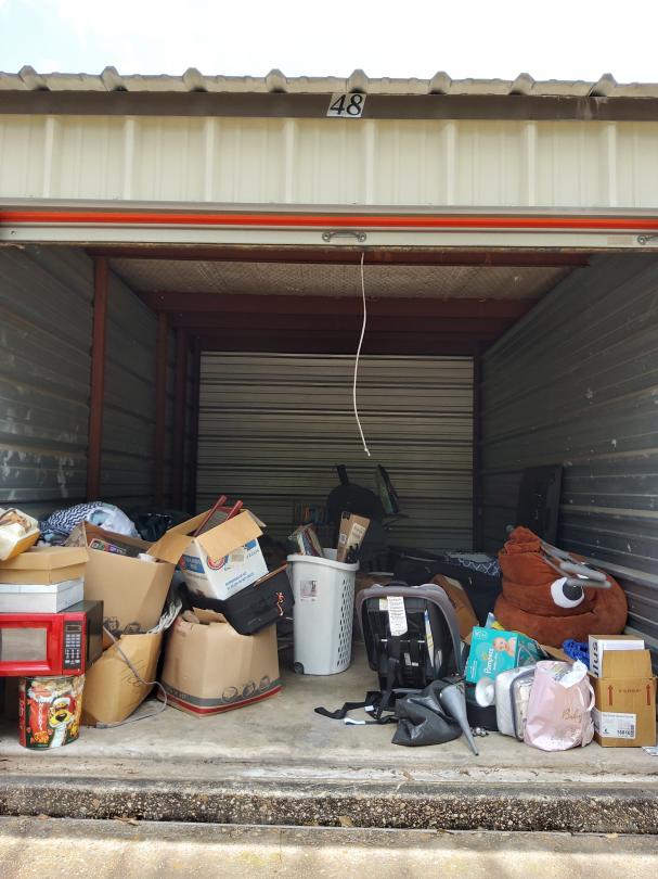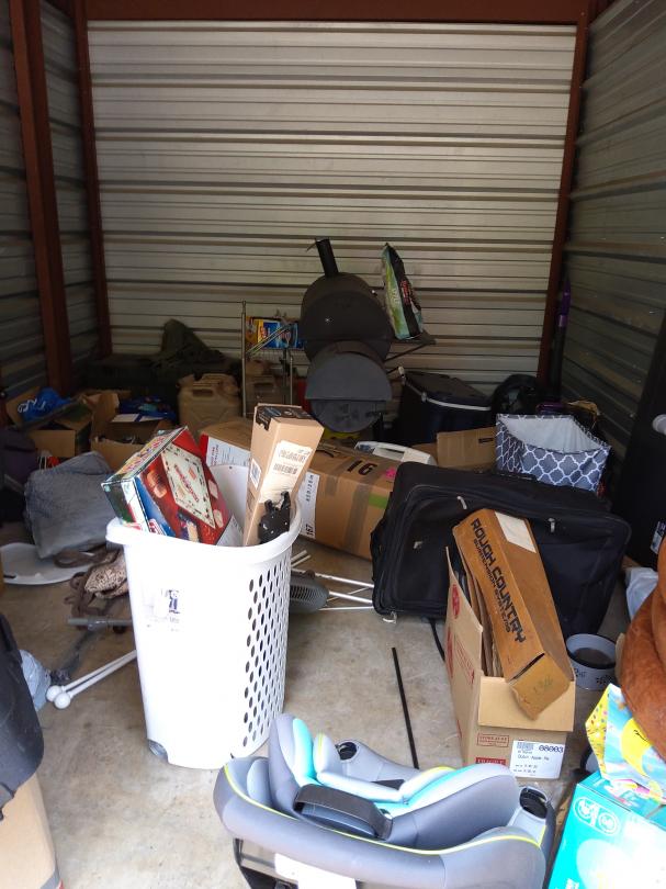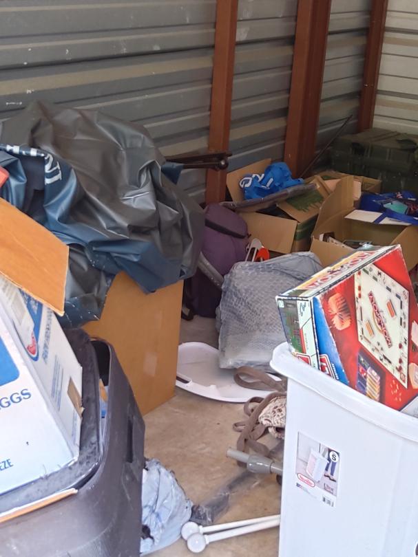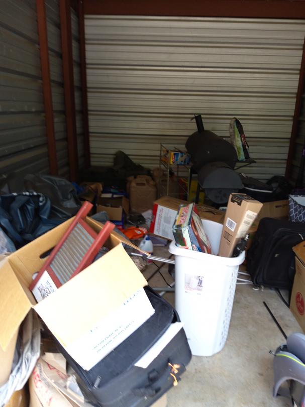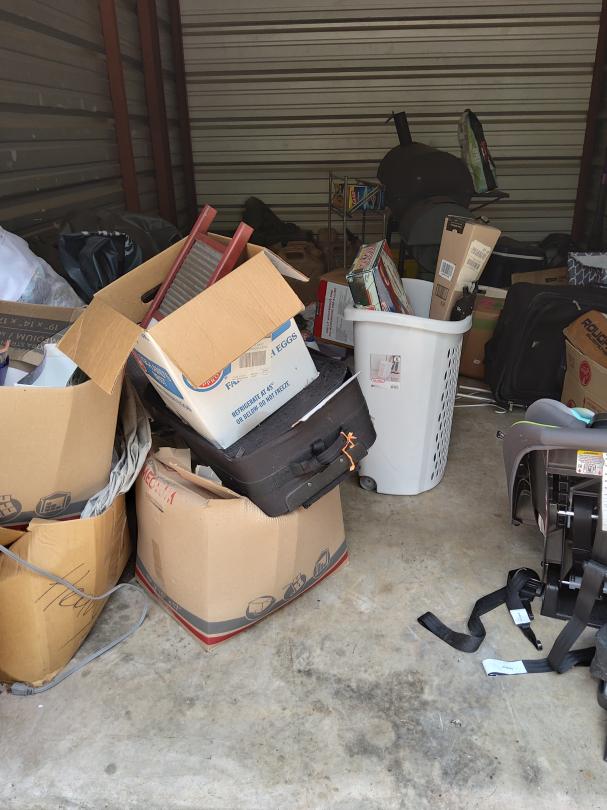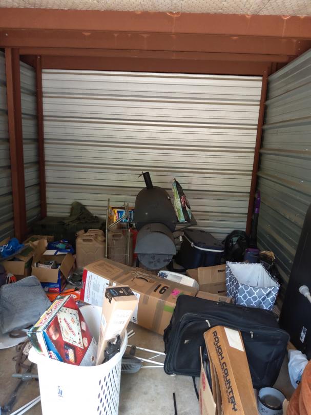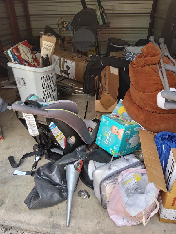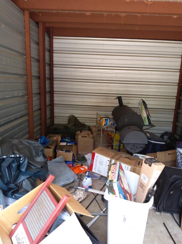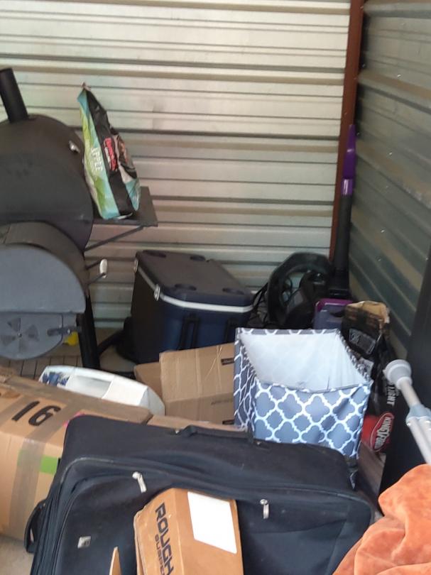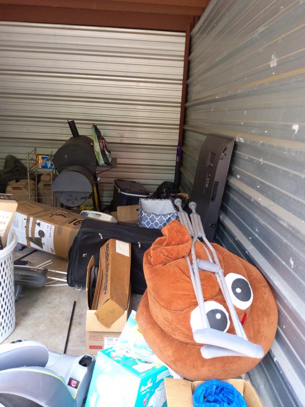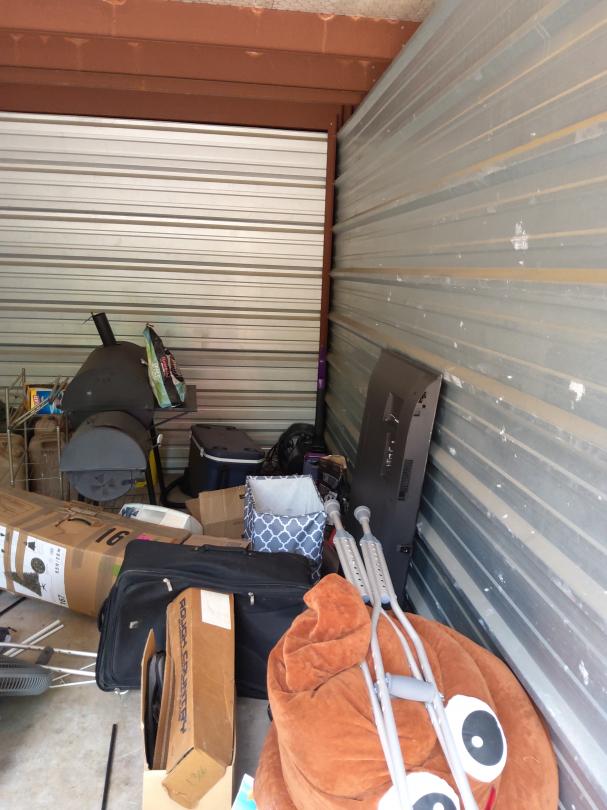 This unit appears to contain…Microwave, pillows, crutches, television, ice chest, car seat, bbq pit, boxes, water bottles, gas can, fan, bags and vacuum