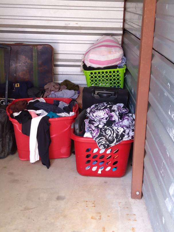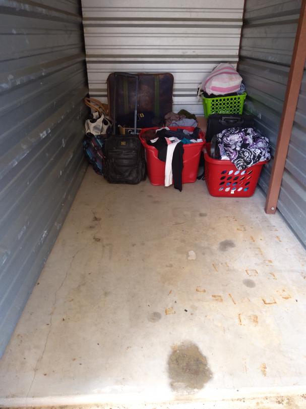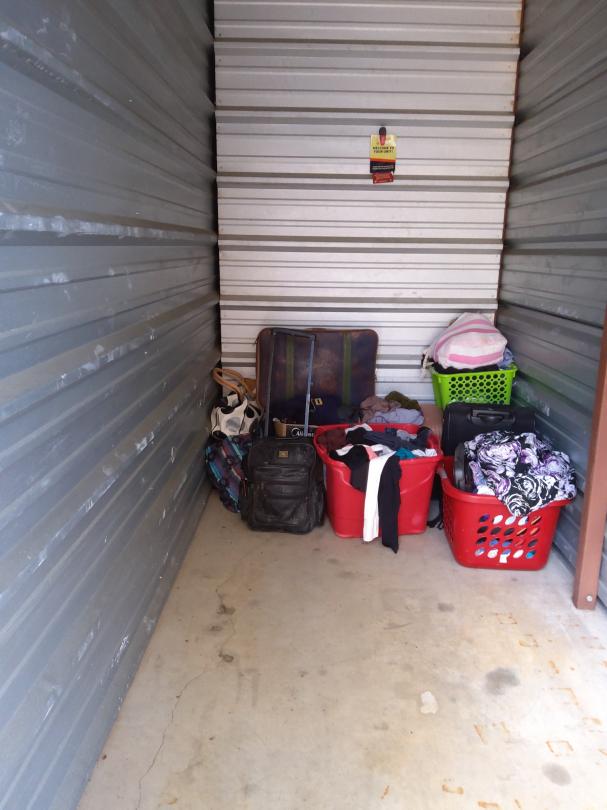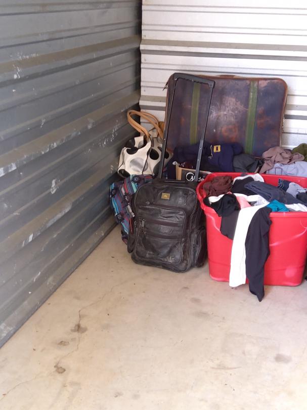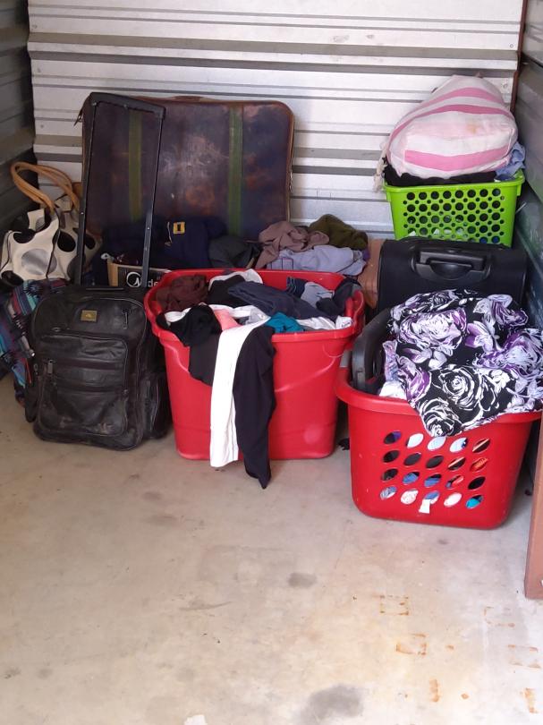 This unit appears to contain…Table, clothes basket, bags, suitcases, boxes