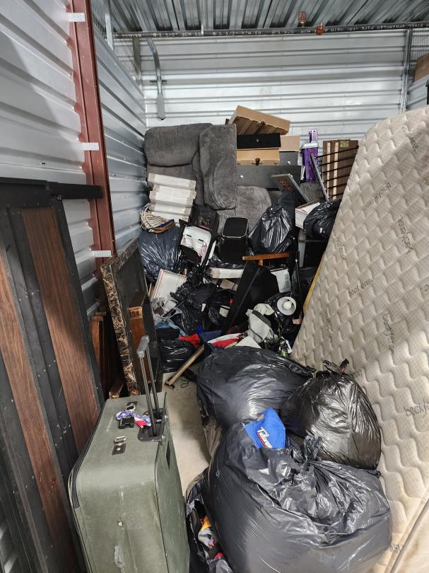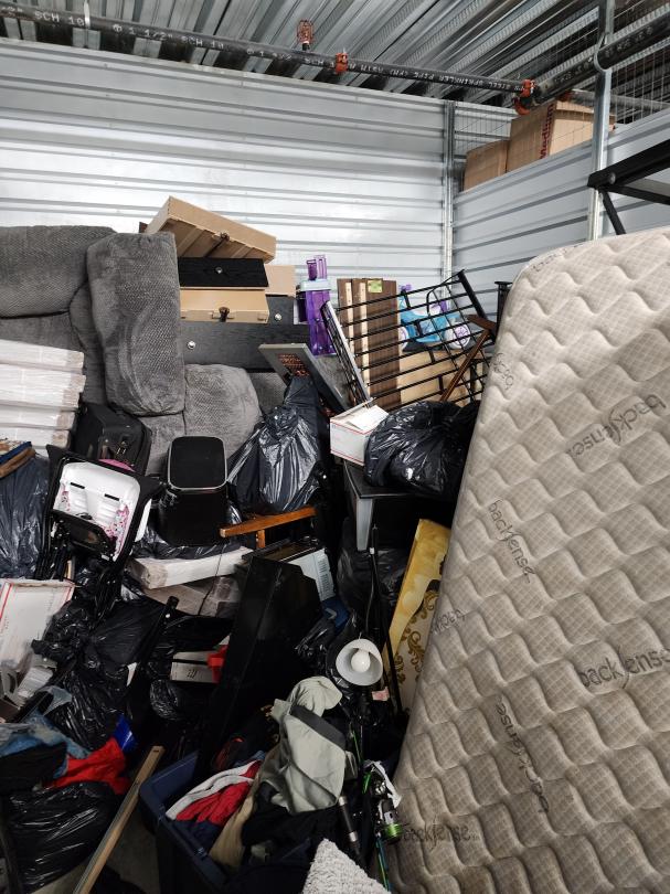 This unit appears to contain…Pictures, back pack, boxes, crock pot, kid's toys, suitcase, pillows, bags of belonings