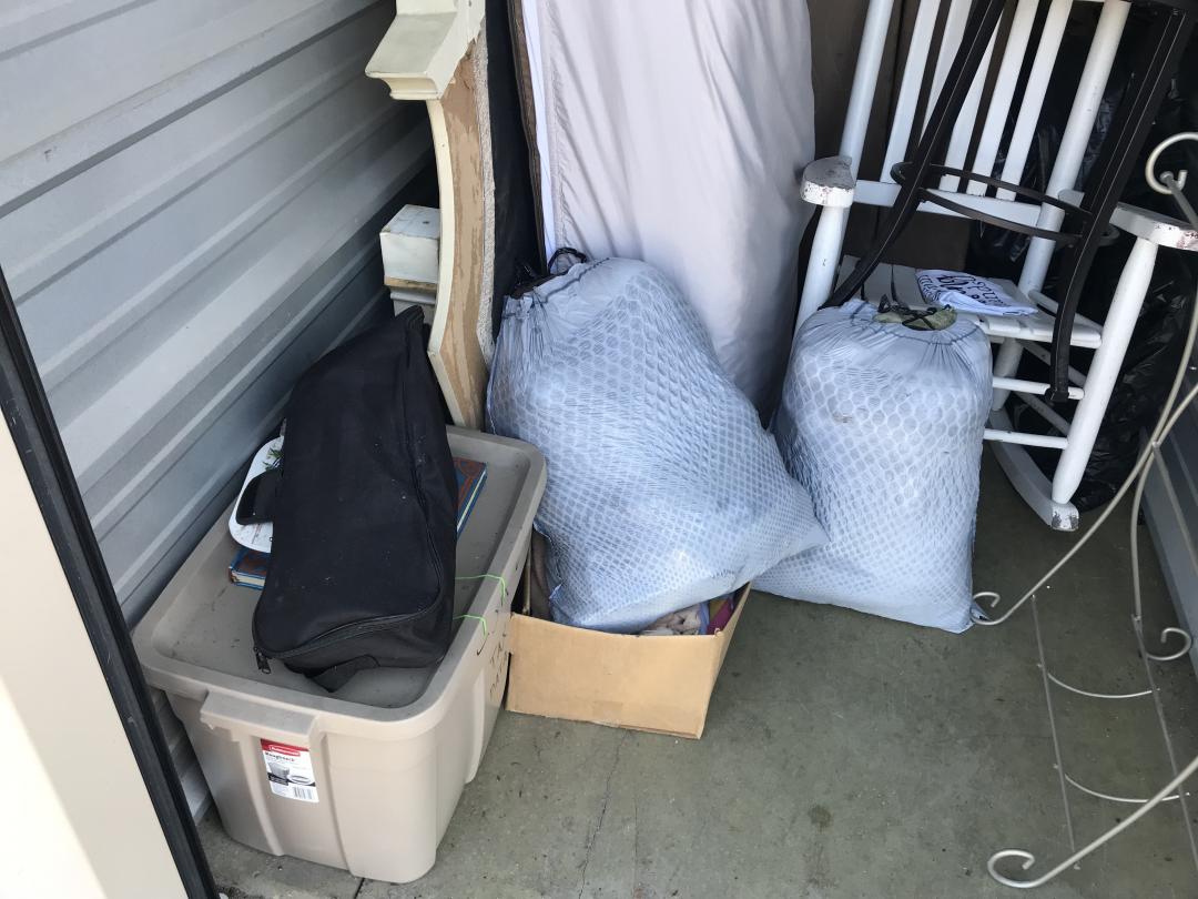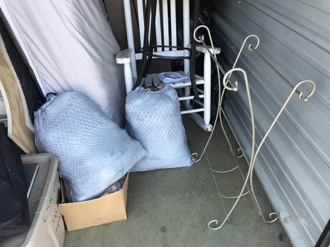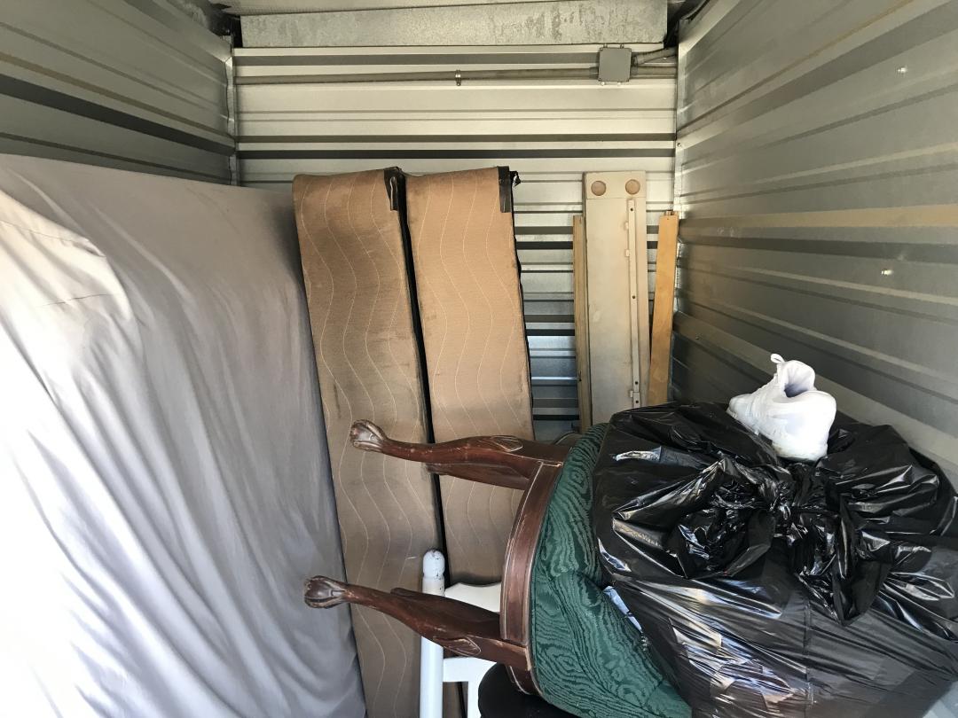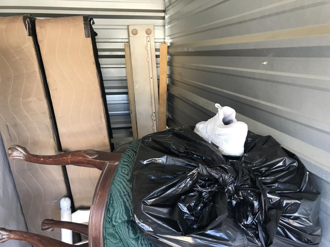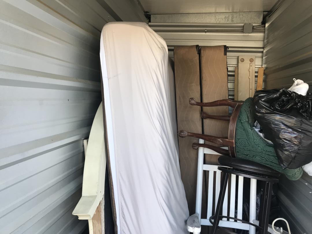 This unit appears to contain…Self Storage: rocking chair, mattress and box springs, plastic tub, bed frame, white bags, black bag, chair,