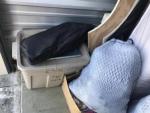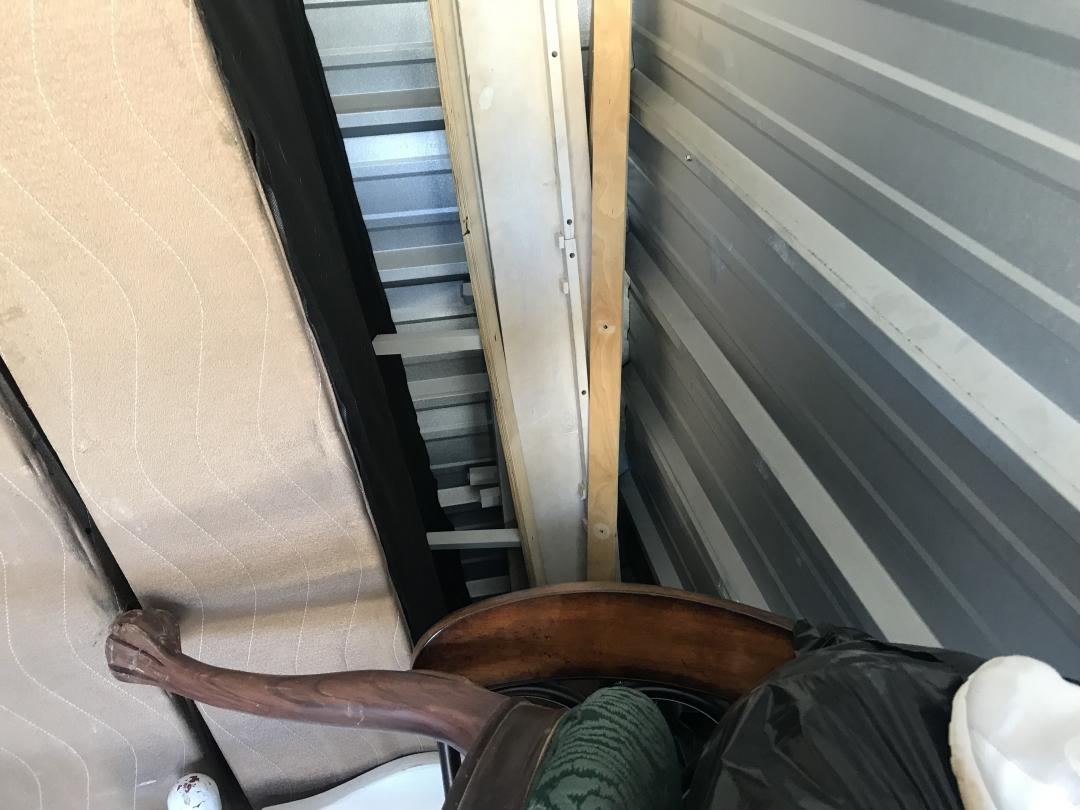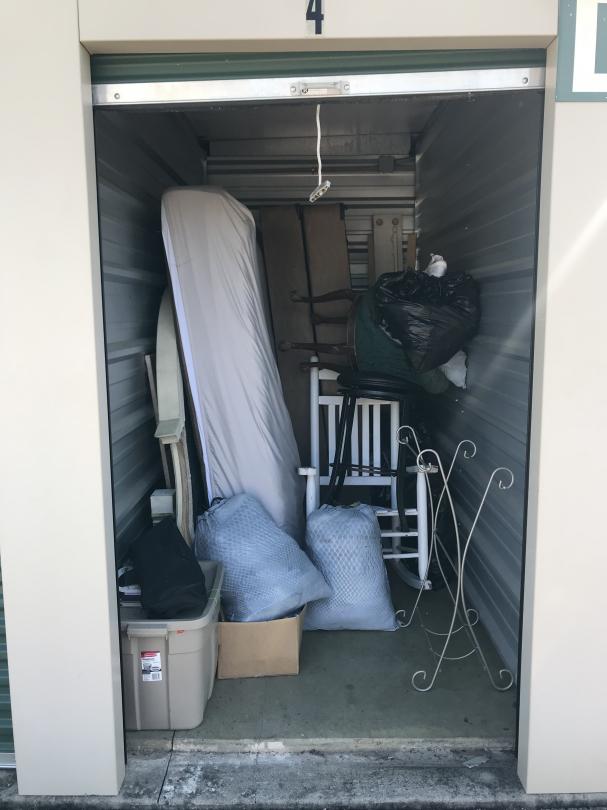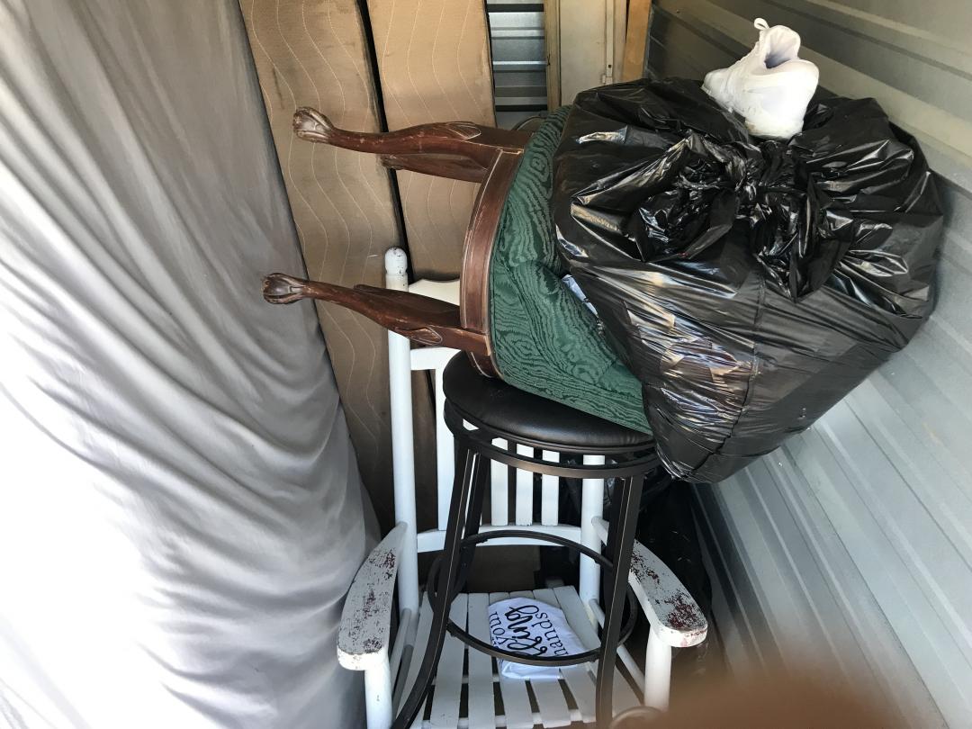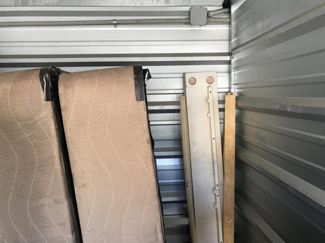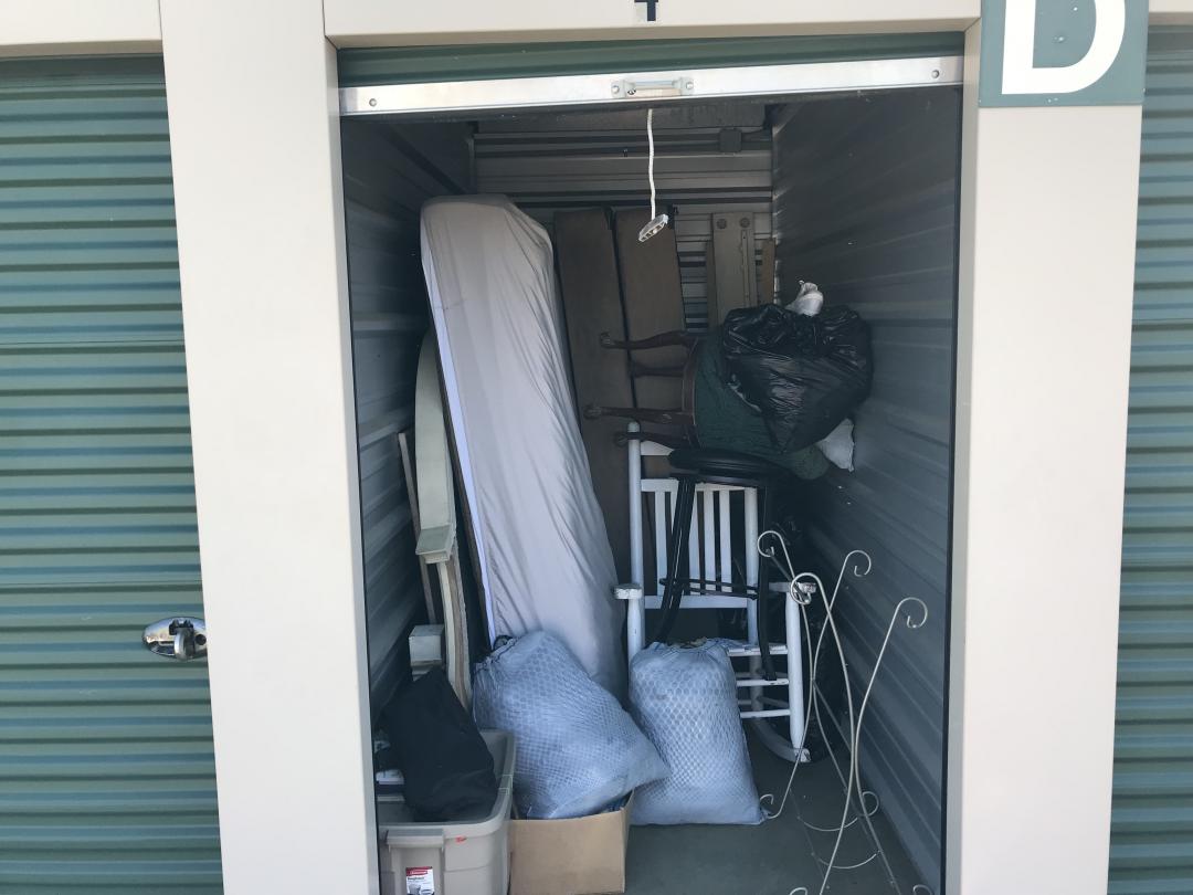 This unit appears to contain…Self Storage: rocking chair, mattress and box springs, plastic tub, bed frame, white bags, black bag, chair,