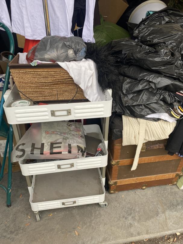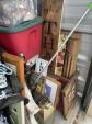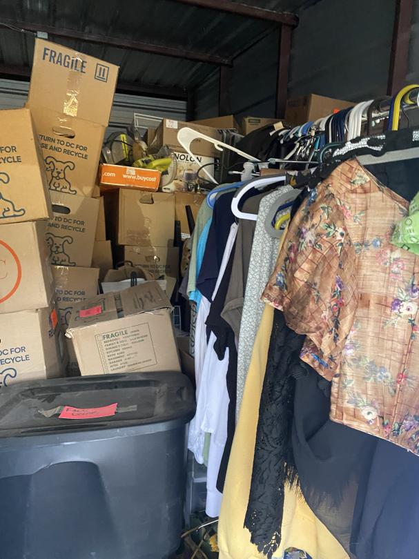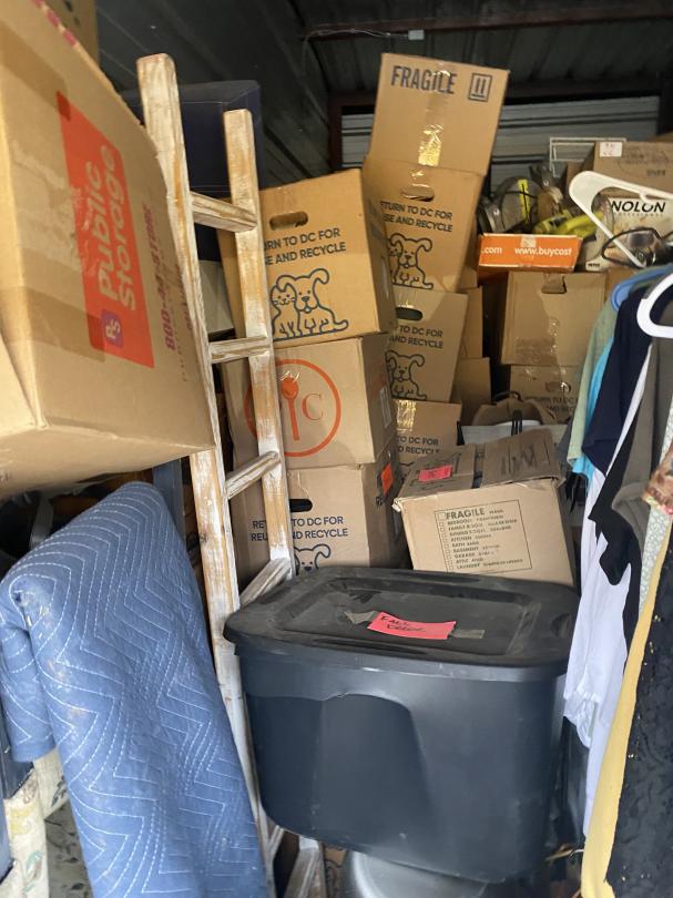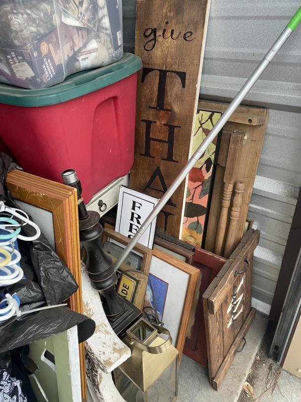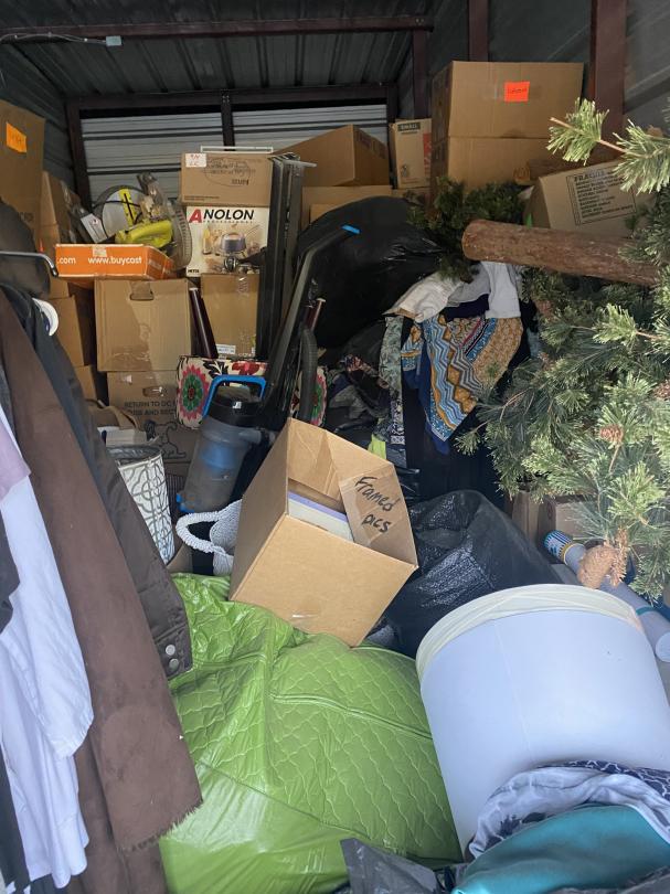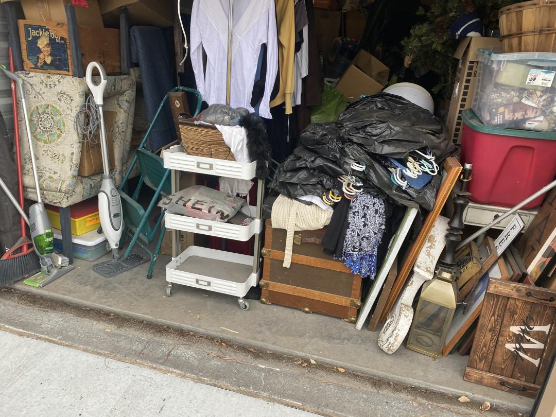 This unit appears to contain…Drive Up Cleaning supplies, chairs, boxes, bins, clothes, metal shelf, holiday items, trunks, bins, step stool, power tools, clothing rack