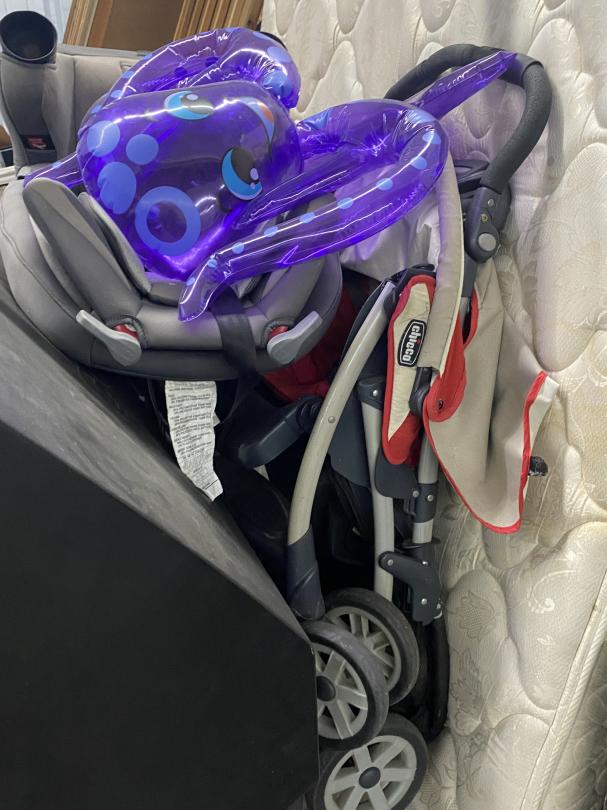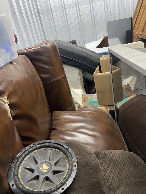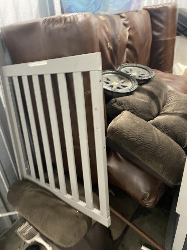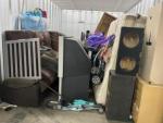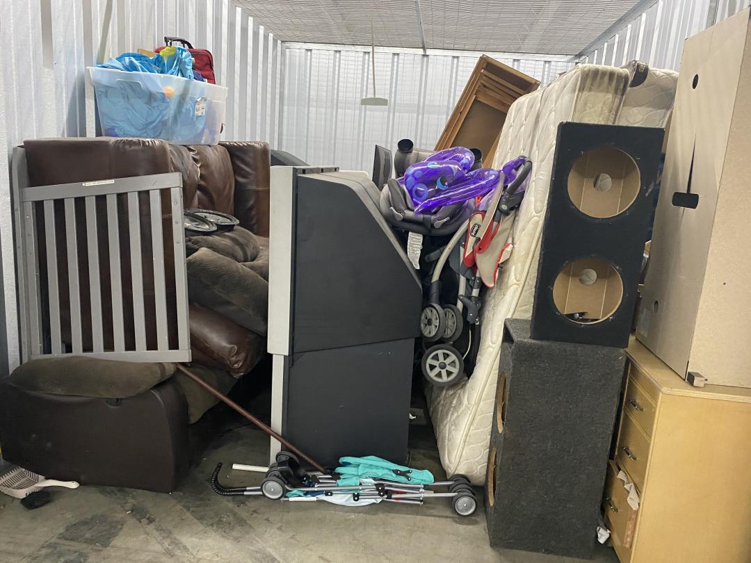 This unit appears to contain…Safe, Loveseat, TV's, Kid items, dresser, speakers, Bins, suite case, Mattress, Box spring, End table, Walking cane