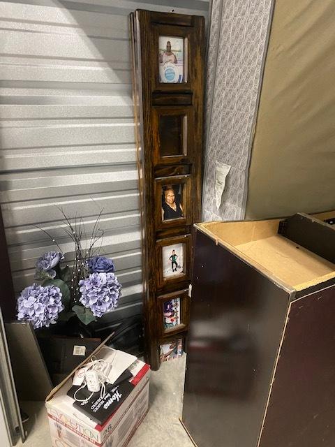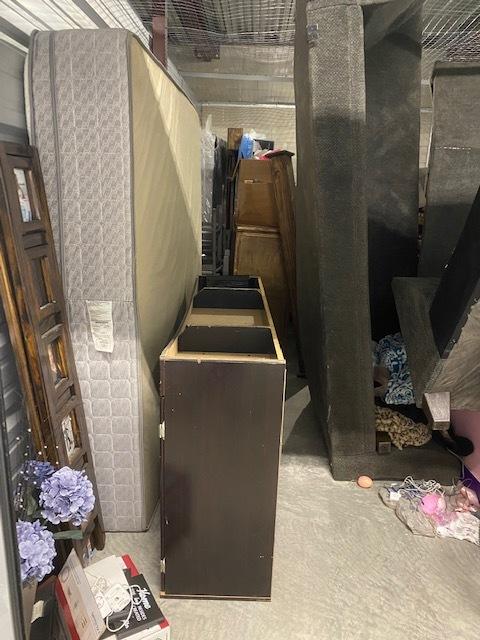 This unit appears to contain…Washer, large wood wine rack, king mattress with split box spring set, coach set, 2- dressers, wood standing picture frame, 2- vases. set of boxed dishes and 2 large vases.