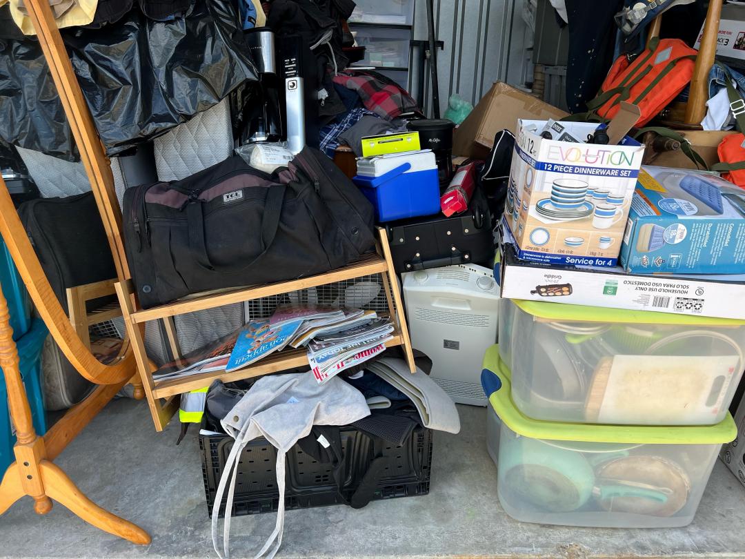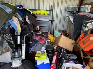 This unit appears to contain…Bags/totes, boxes, bed frame, cabinets, box spring, mattress, mirror, small appliances, monitor, night stand, clothes, dresser, fan, inflatable mattress.