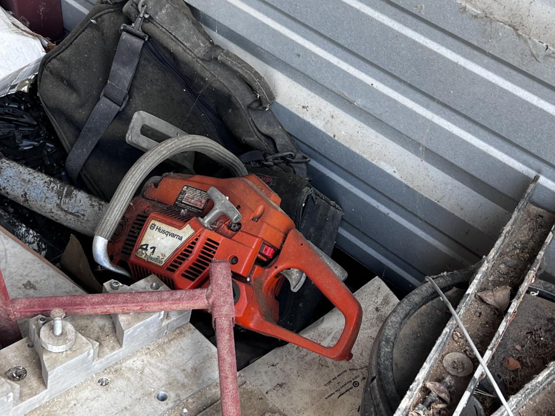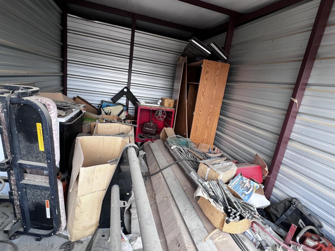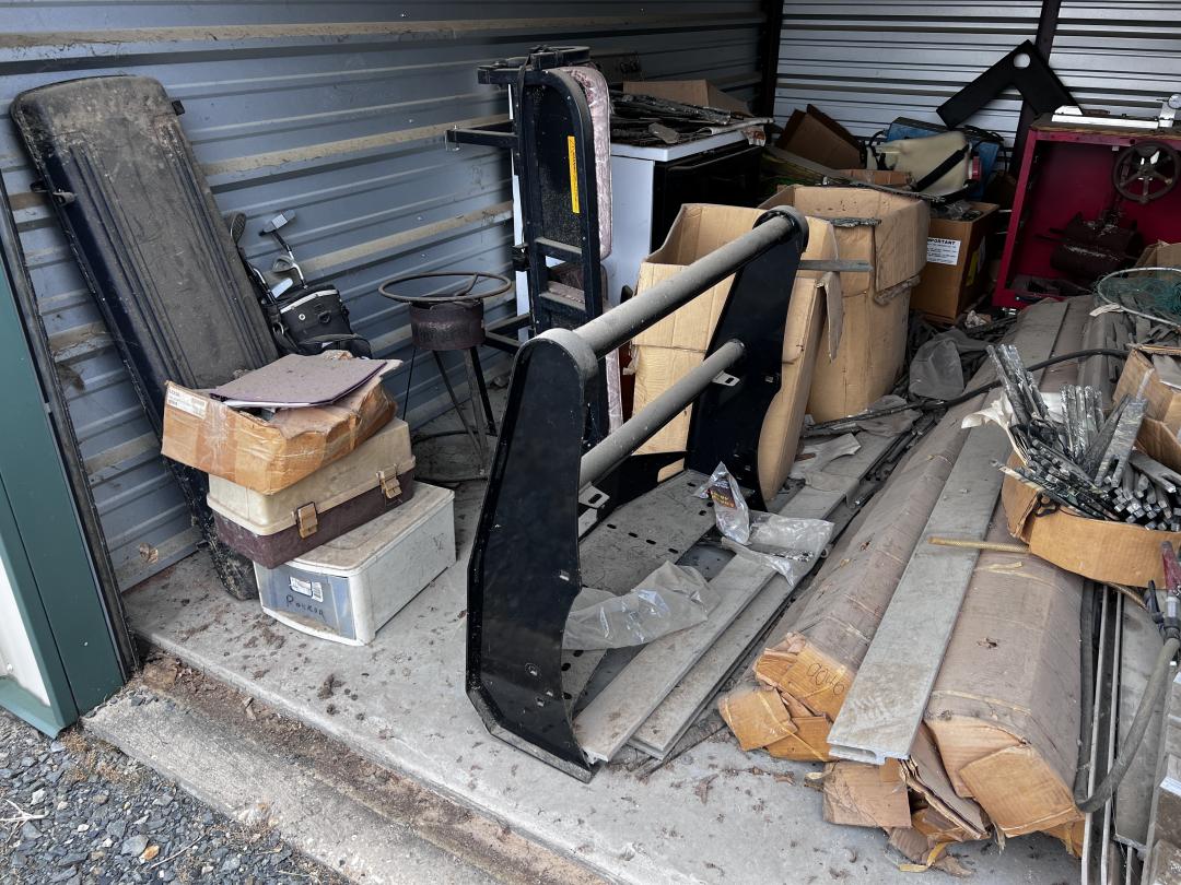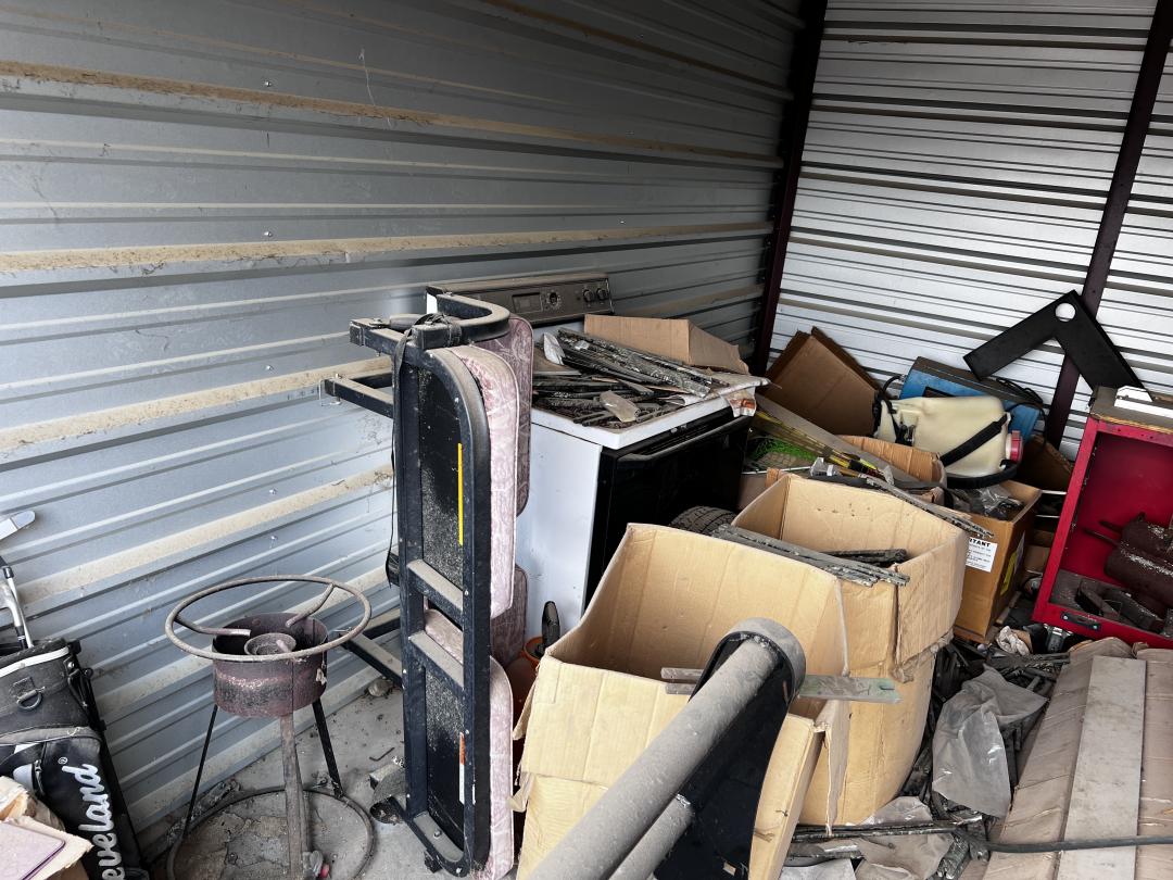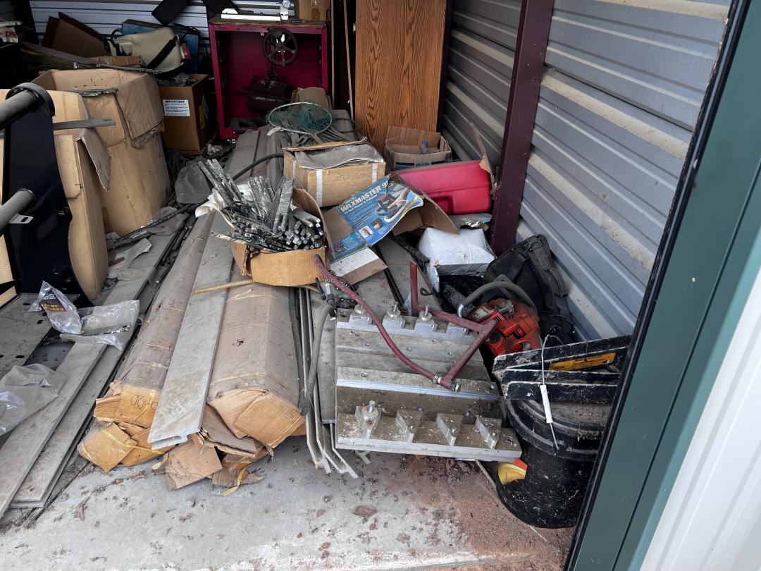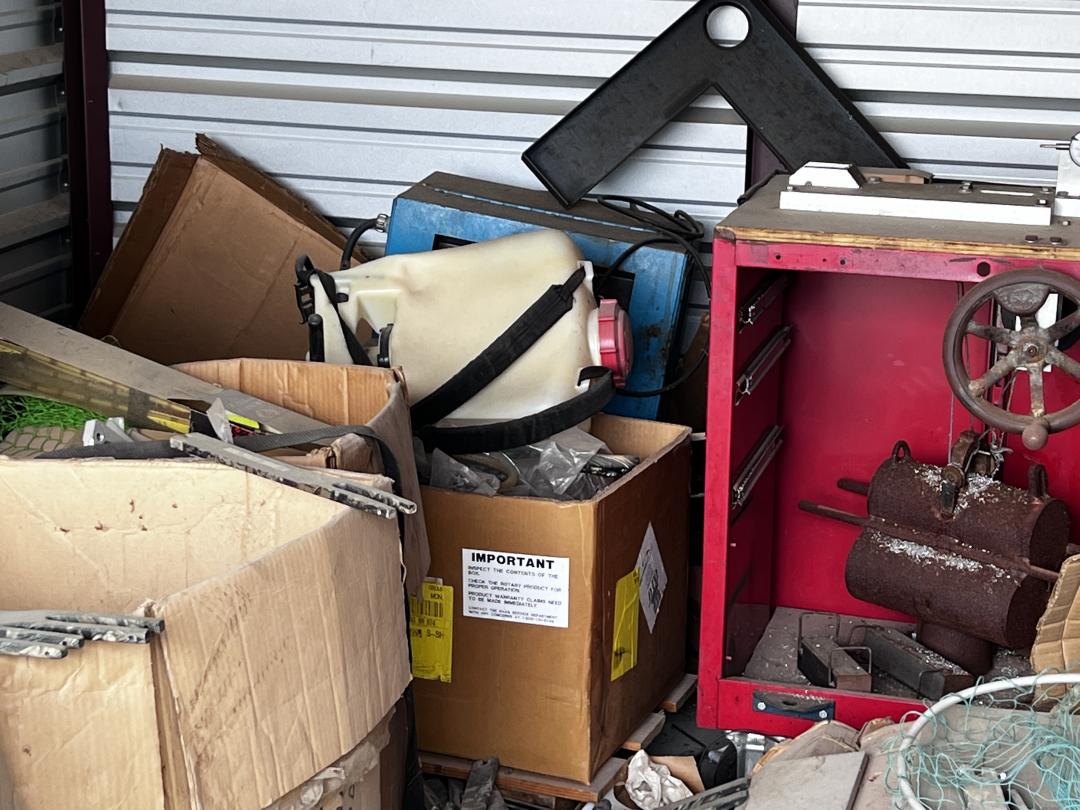This unit appears to contain…Golf clubs, truck front grille guard, bow building items. machine cabinet, stove, metal, bench, chainsaw
